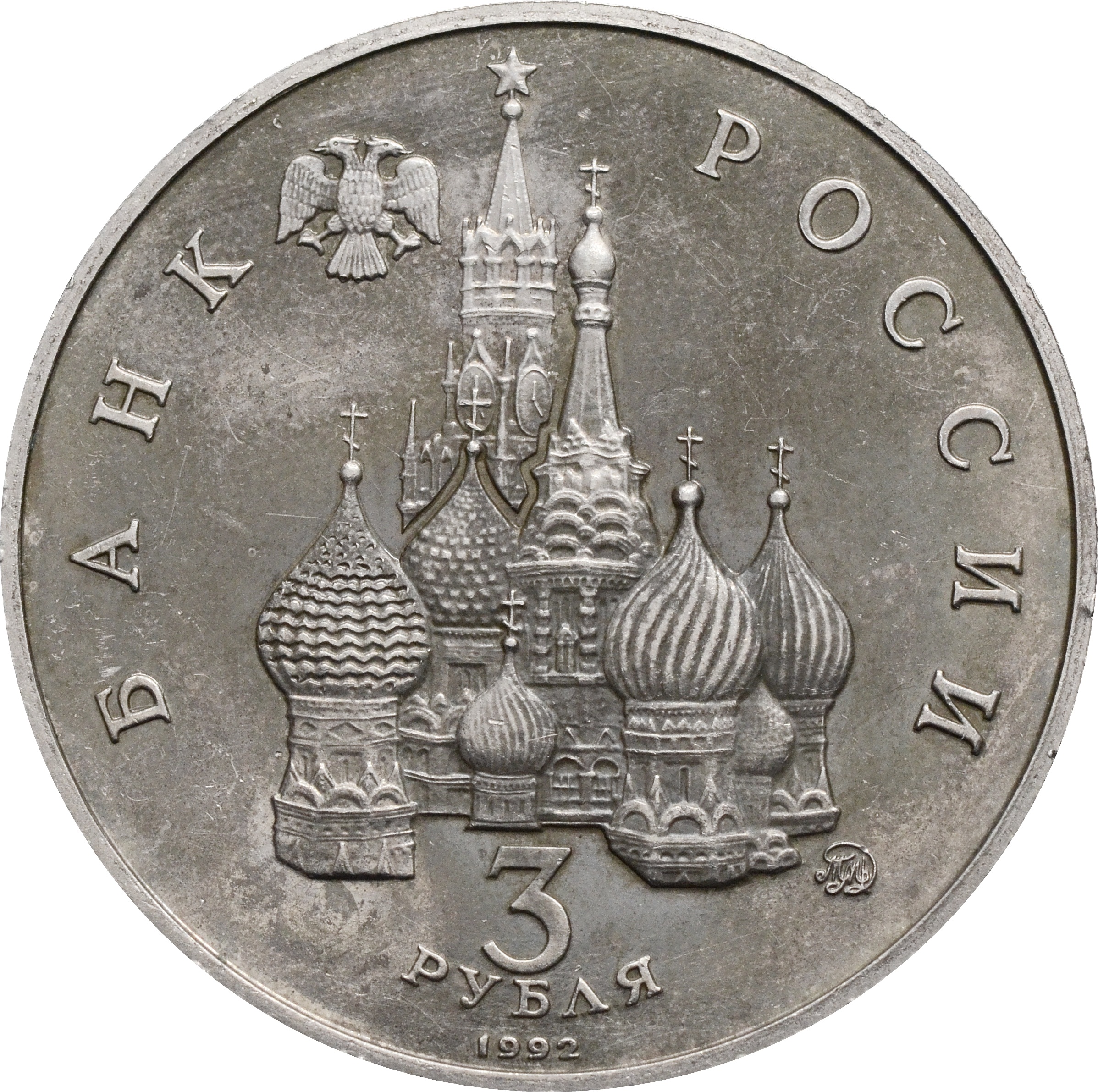 Аверс: по центру изображён собор Василия Блаженного (Покровский собор) в Москве. Под ним справа знак Московского монетного двора, а наверху слева эмблема Банка России. Вдоль канта монеты надпись: "БАНК РОССИИ". Снизу указан номинал в две строки: "3 РУБЛЯ", под ним год чеканки: "1992".