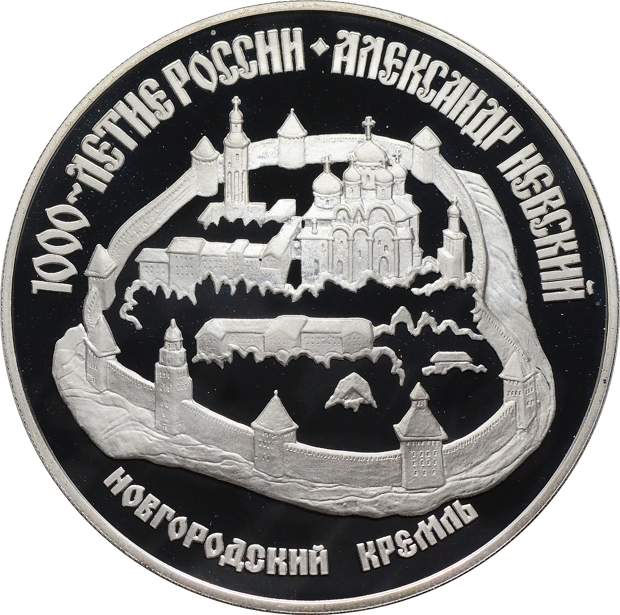 Реверс: по центру монеты расположено рельефное изображение панорамы на Новгородский кремль. Вдоль канта надписи: сверху - "1000-ЛЕТИЕ РОССИИ АЛЕКСАНДР НЕВСКИЙ", а снизу - "НОВГОРОДСКИЙ КРЕМЛЬ".