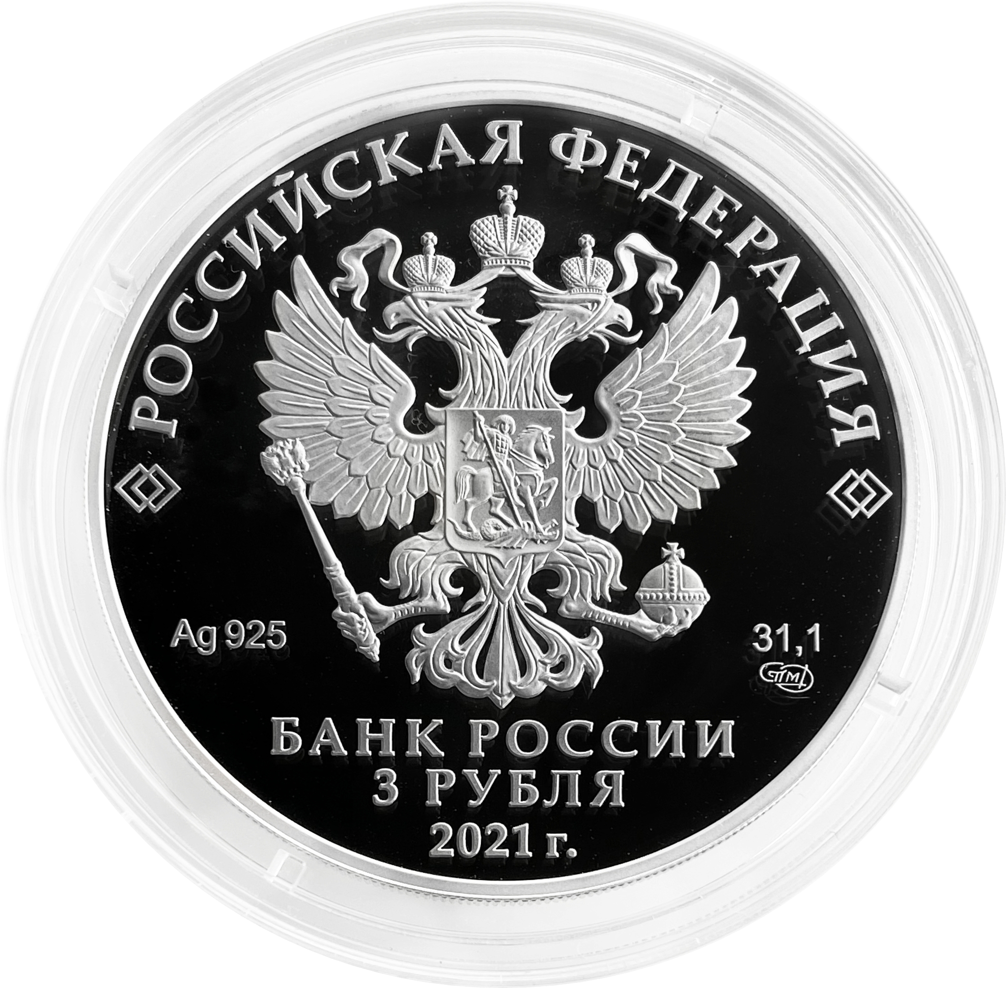 Аверс: в центре монеты размещен государственный герб РФ. Над ним, вдоль канта, надпись полукругом: "РОССИЙСКАЯ ФЕДЕРАЦИЯ", обрамленная с обеих сторон сдвоенными ромбами. Справа размещен товарный знак монетного двора и вес монеты: "31,1". Снизу, под гербом надпись: "БАНК РОССИИ", ниже указан номинал и год чеканки: "3 РУБЛЯ 2021г.". Слева указан метал монеты: "Ag 925".