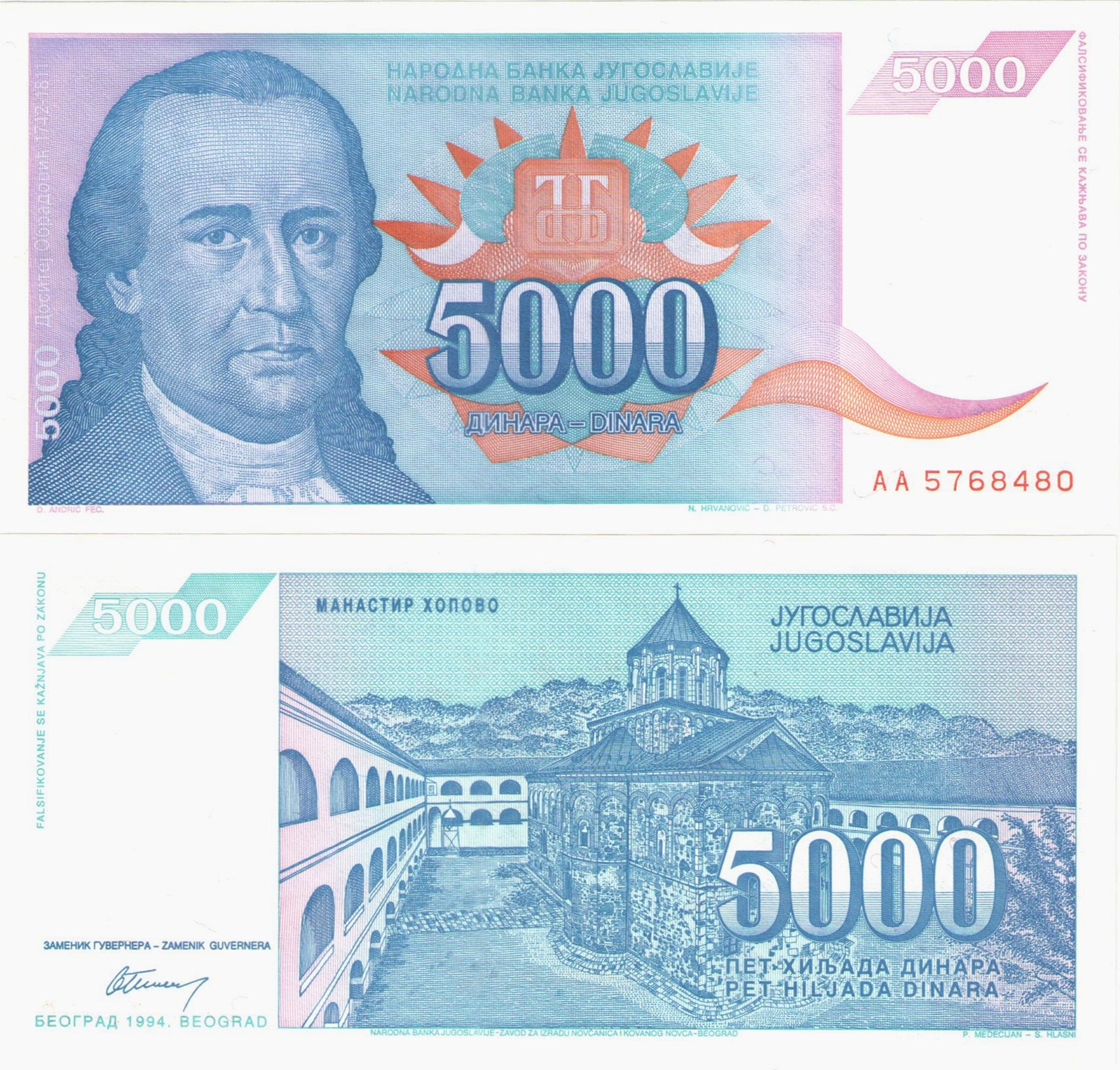 Оборотная сторона: по центру изображен монастырь Хопово и номинал банкноты: "500000 / ПЕТ СТОТИНА ХИЛЬАДА ДИНАРА / PET STOTINA HILJADA DINARA ". Выше официальное название страны на двух языках: "JUGOSLAVIJA / JУГОСЛАВИJА". В левом верхнем углу номинал цифрой - "5000". Снизу подписи управляющих и надпись: "БЕОГРАД 1994. BEOGRAD".