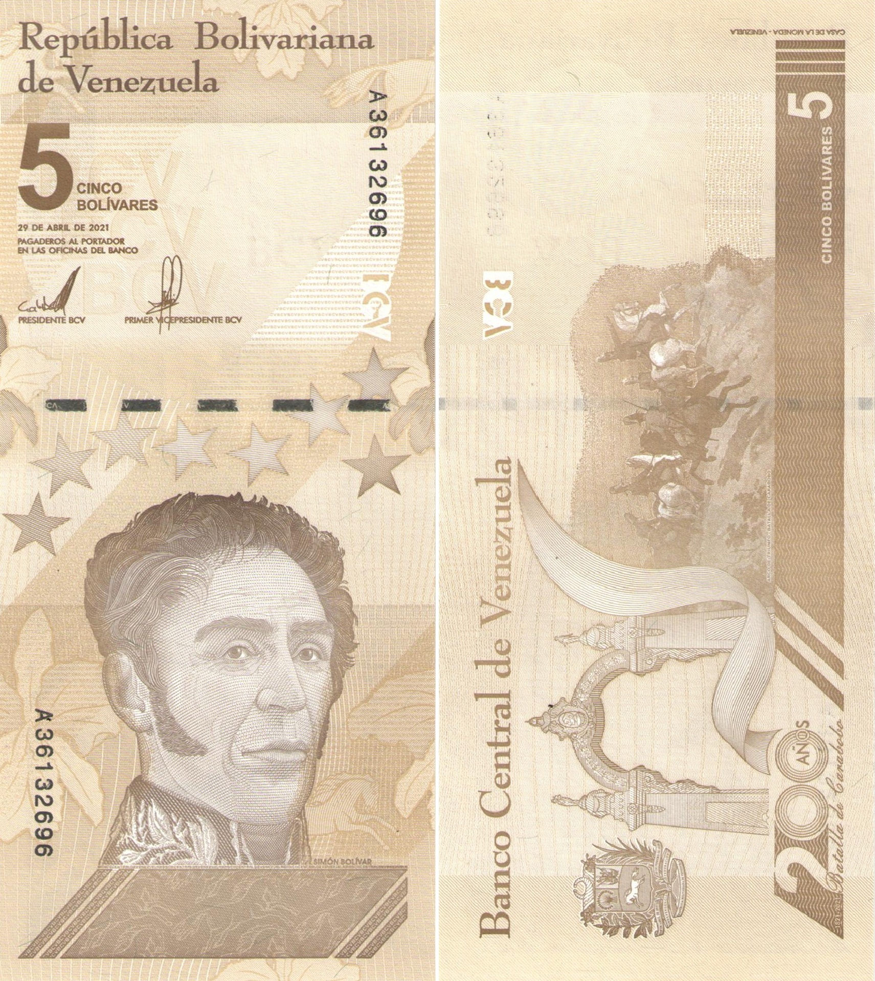 Лицевая сторона: в нижней части банкноты изображен портрет Симо́на Боли́вара - наиболее влиятельного и известного из руководителей войны за независимость испанских колоний в Америке. Национальный герой Венесуэлы. Генерал. В верхней части надпись: "Republica Bolivariana de Venezuela". Чуть ниже надписи правее, указан серия и номер банкноты. В левой части сверху, прописан номинал: "5 CINCO BOLIVARES".