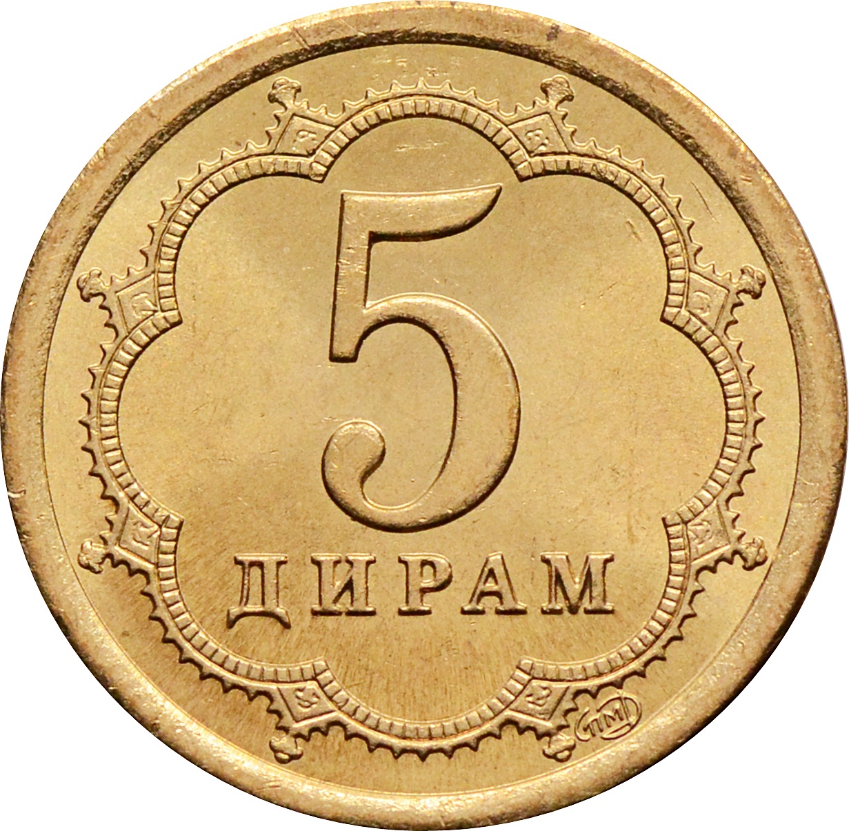 Реверс: по центру монеты указан номинал: "5 Дирам", по кругу кольцевой орнамент.