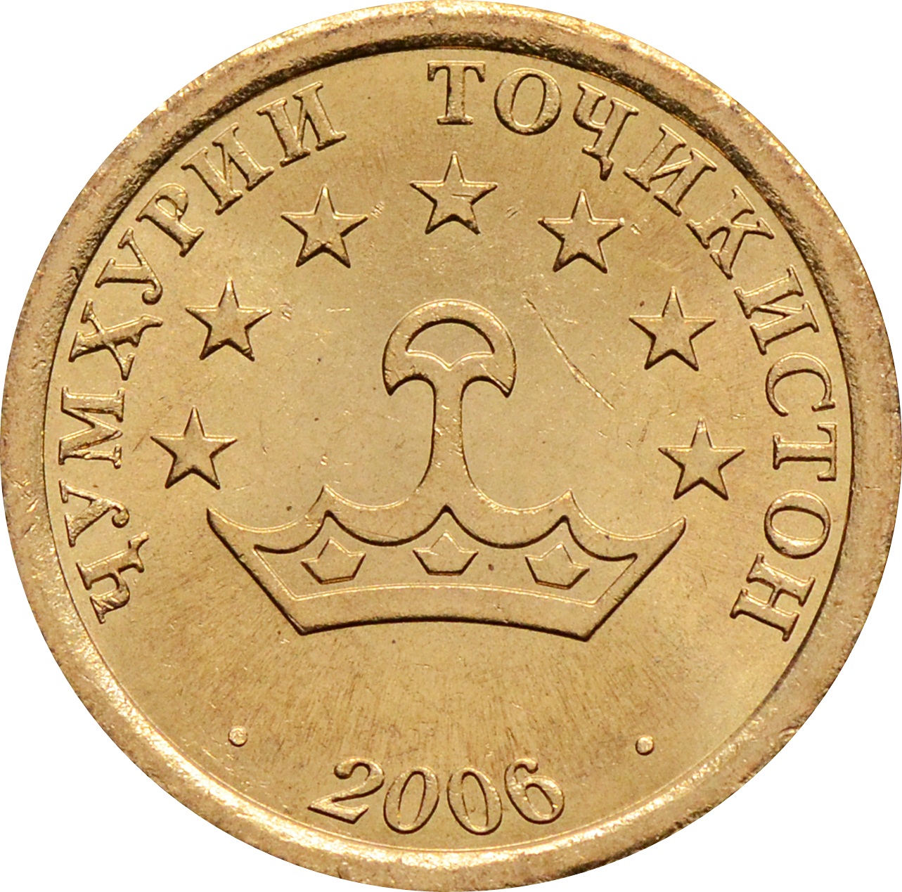 Аверс: в центре монеты изображение короны. Над ней, полукругом 7 звезд (символизируют 7 исторических областей страны). По канту наименование государства на национальном языке: "ҶУМҲУРИИ ТОҶИКИСТОН". Снизу расположен год чеканки: "2006".