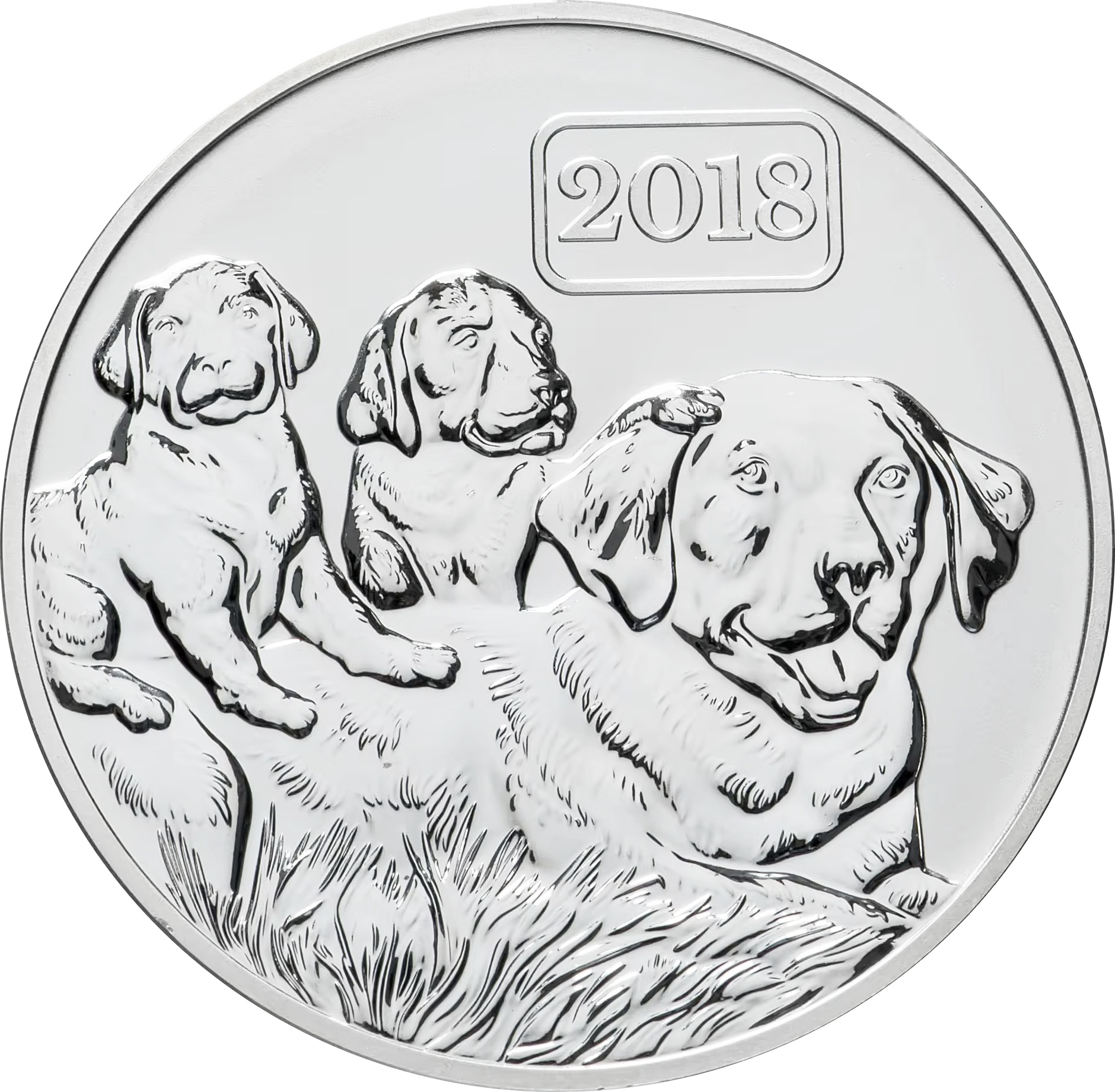 Реверс: по центру изображена собачья семья. Над ними год чеканки монеты: "2018".
