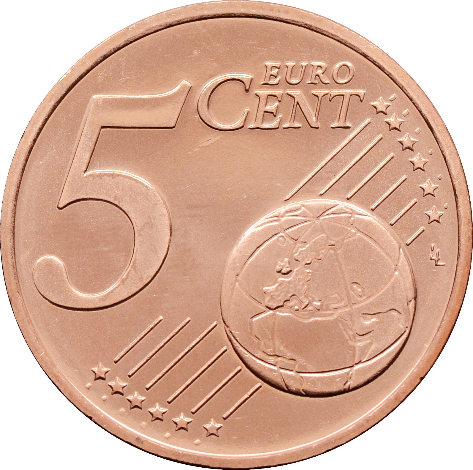 Реверс: в центре указан номинал монеты: "5 EURO CENT". От нижнего левого к верхнему правому краю, по диагонали, проходят шесть линий, на концах которых расположено 12 звёзд. Справа внизу на середине линий изображён земной шар, на переднем плане земного шара представлена европейская часть континента.