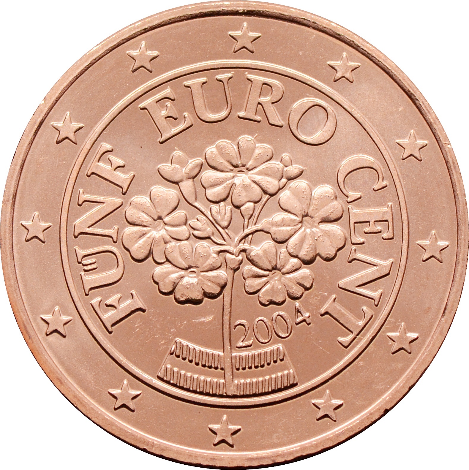 Аверс: по центру изображение цветка Альпийская примула и надпись: "FUNF EURO CENT". Ниже год чеканки: "2004" и флаг страны. Вдоль канта, по кругу, 12 звёзд.