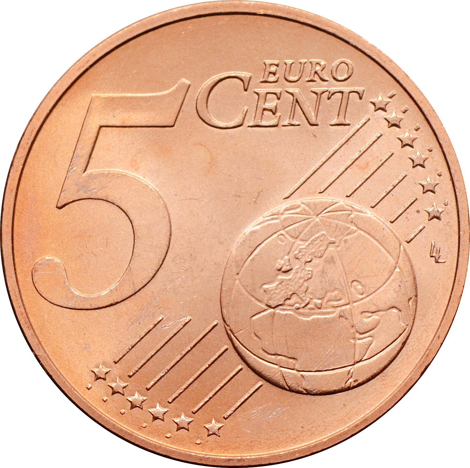 Реверс: в центре указан номинал монеты: "5 EURO CENT". От нижнего левого к верхнему правому краю, по диагонали, проходят шесть линий, на концах которых расположено 12 звёзд. Справа внизу на середине линий изображён земной шар, на переднем плане земного шара представлена европейская часть континента.