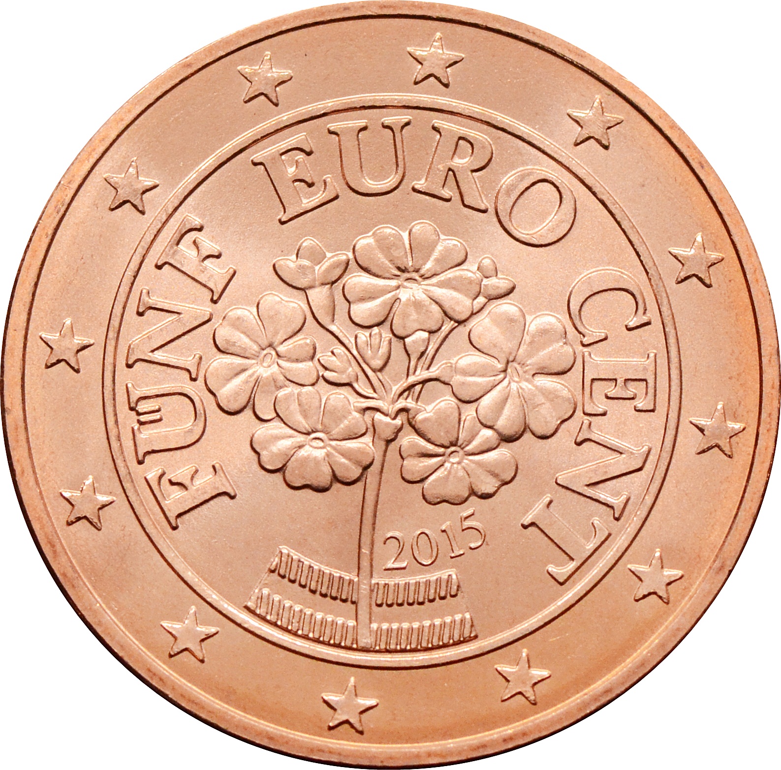 Аверс: по центру изображение цветка Альпийская примула и надпись: "FUNF EURO CENT". Ниже год чеканки: "2015" и флаг страны. Вдоль канта, по кругу, 12 звёзд.