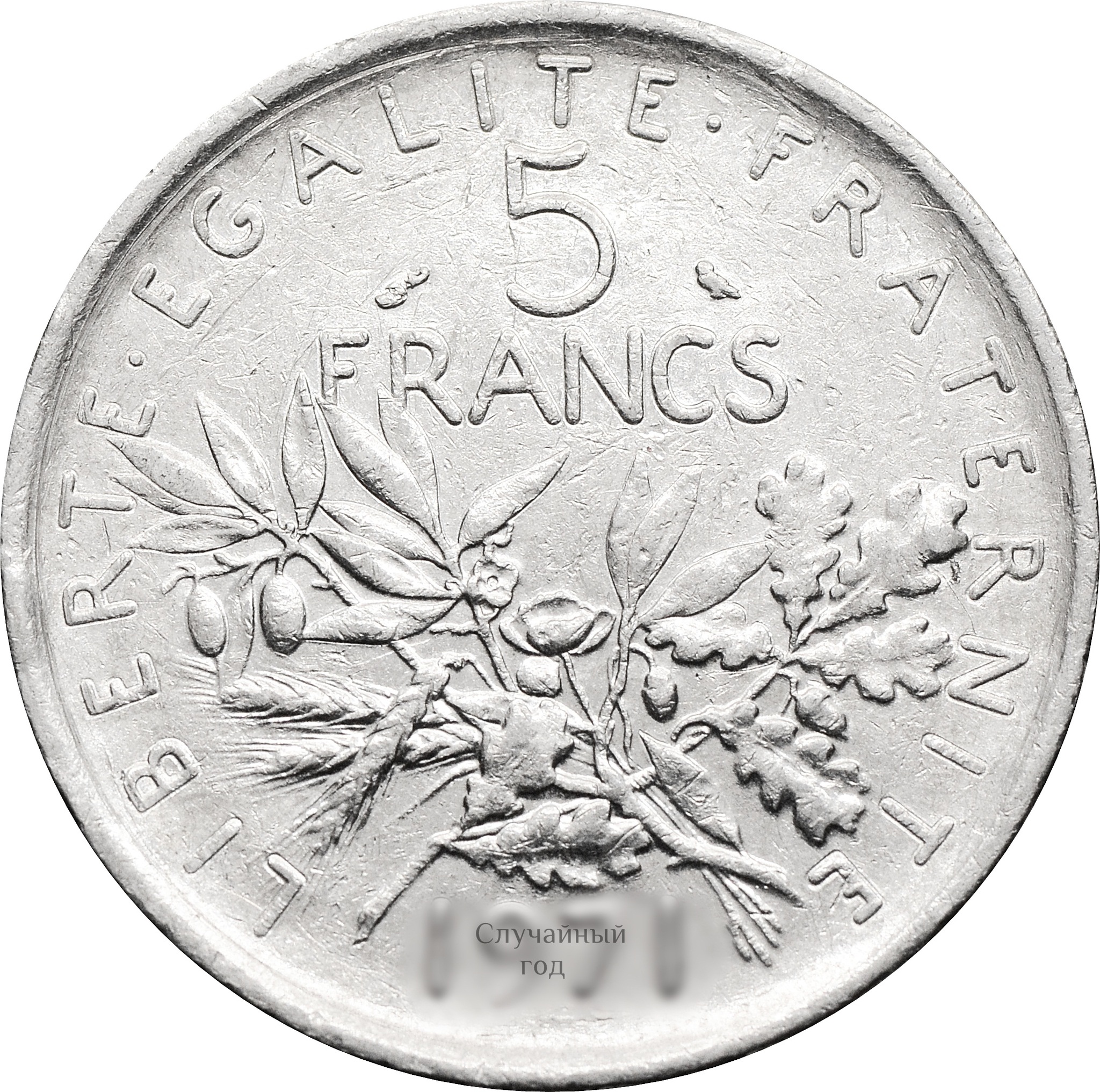 Реверс: чуть выше центра указан номинал в две строки: "5 FRANCS". Внизу указан год чеканки монеты. По канту монеты, полукругом, девиз Республики: "LIBERTE • EGALITE • FRATERNITE". В центре изображение оливковой и дубовой ветвей.