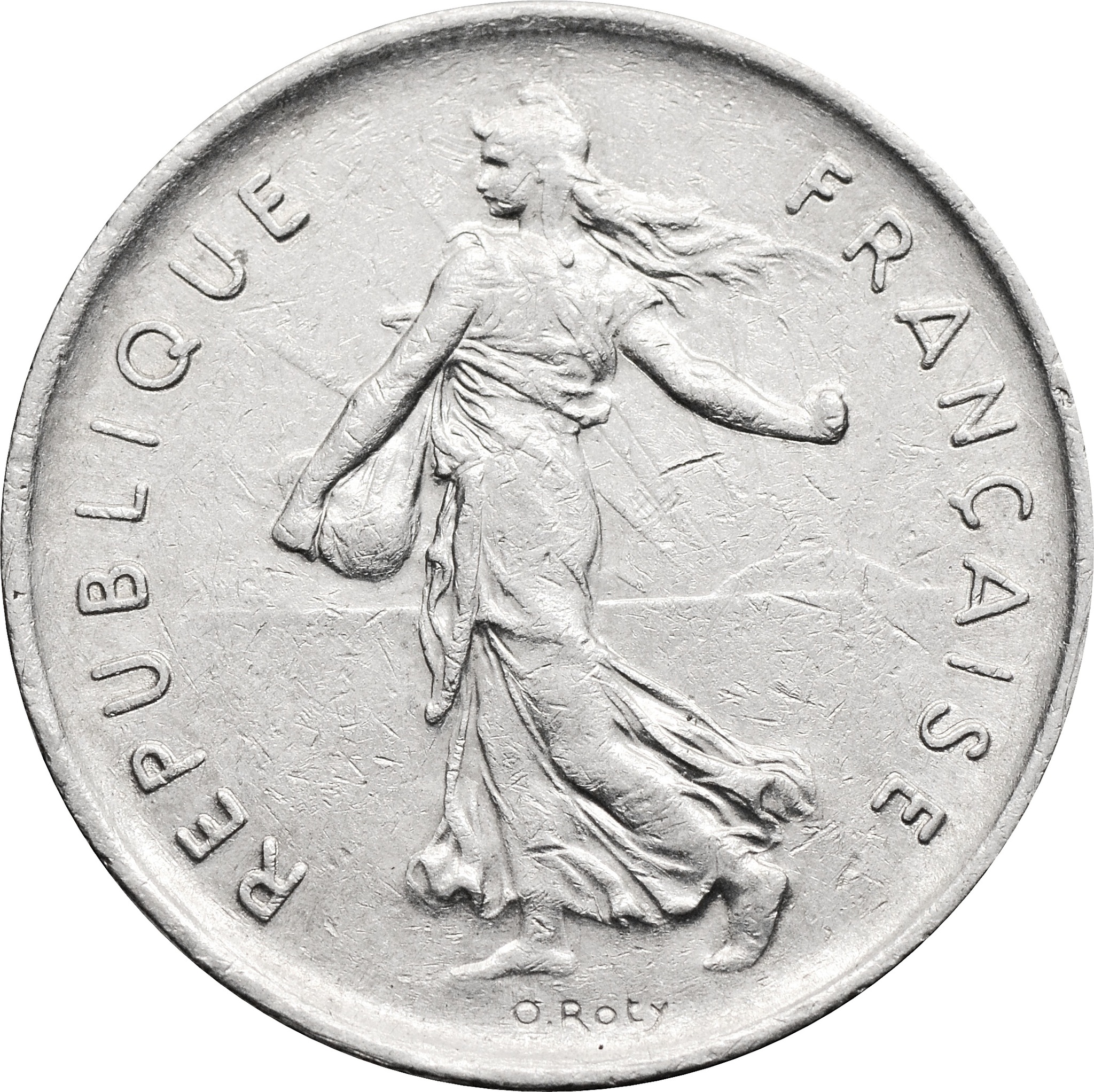 Аверс: в центре изображена фигура сеятеля Марианны во Фригийском колпаке, на фоне заката. Вдоль левого края надпись - "REPUBLIQUE", а правого - "FRANÇAISE".
