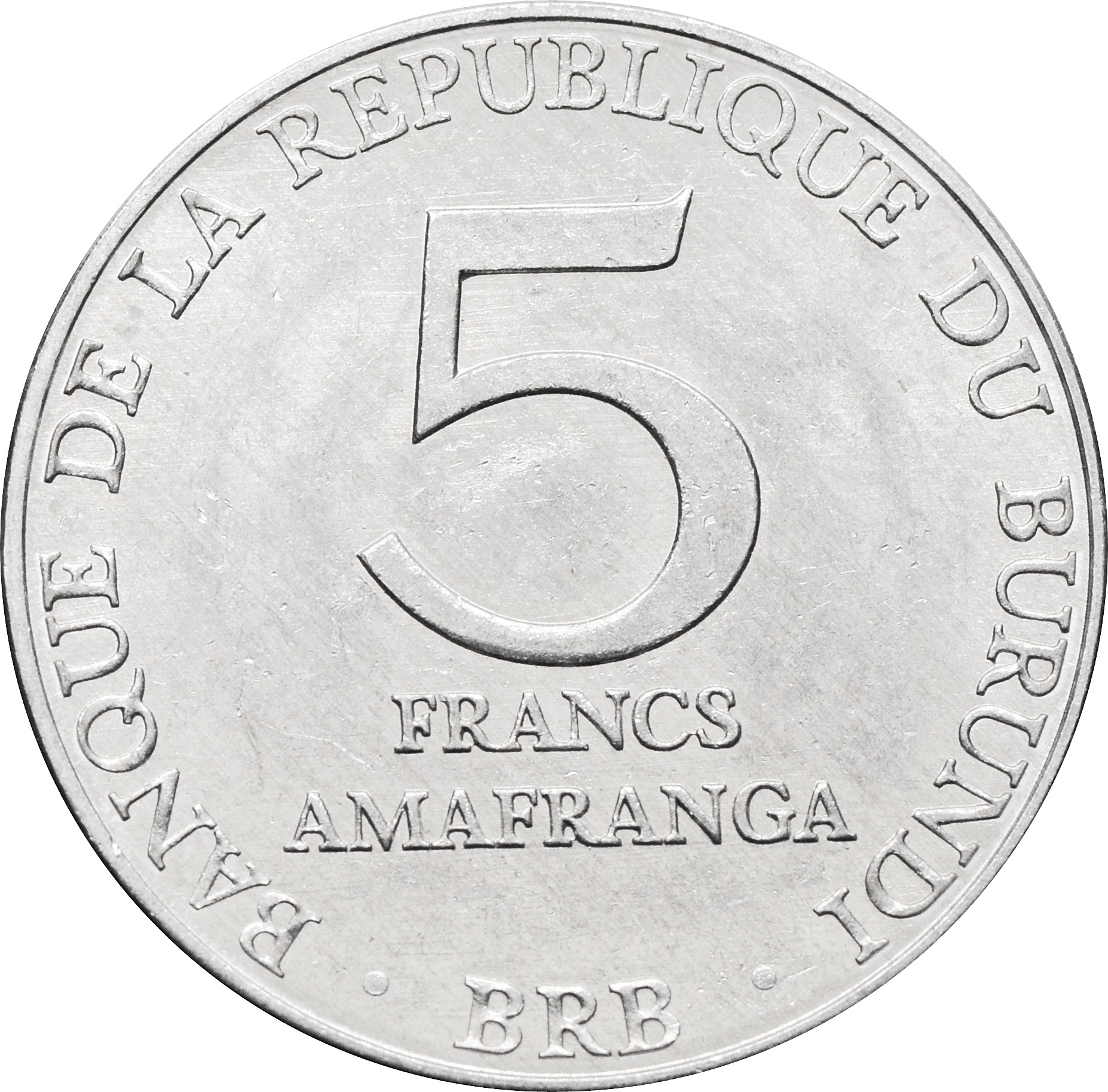 Реверс: по центру указан номинал: "5 FRANCS AMAFRANGA". Вдоль канта надпись: "BANQUE DE LA REPUBLIQUE DU BURUNDI BRB".