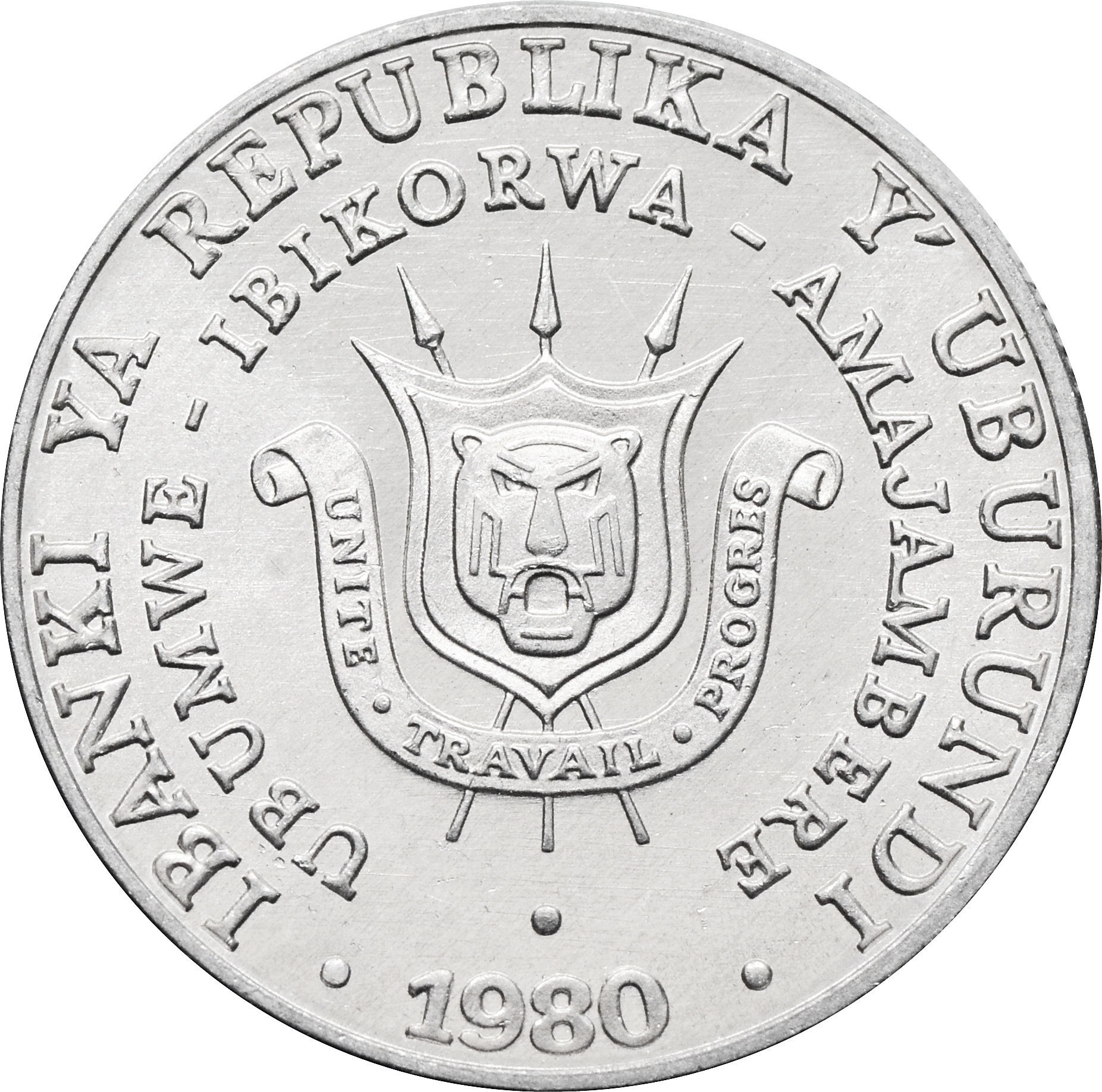 Аверс: в центре монеты изображен герб страны. Вдоль канта сверху расположена надпись: "UBUMWE IBIKORWA AMAJAMBERE". Внизу год чеканки: "1980".