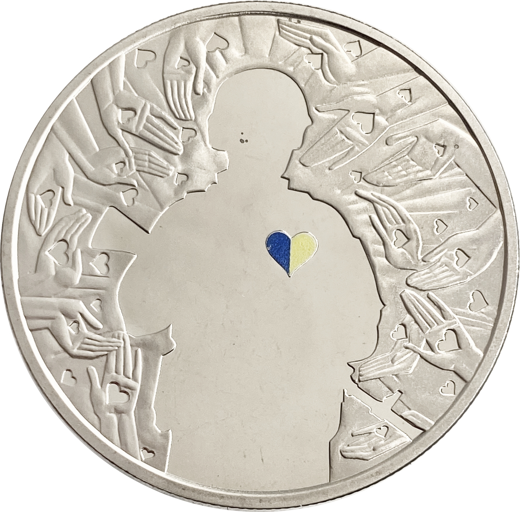 Реверс: по центру изображен абрис украинского воина с символическим желто-голубым сердцем, выполненным с использованием тампопечати, к которому со всех сторон протянуты стилизованные ладони с сердцами, символизирующими любовь, заботу, опеку, пожертвование и доброту.
