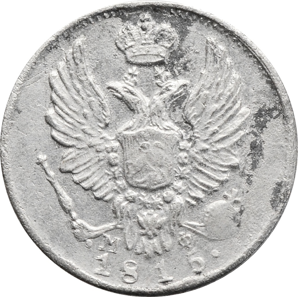 Аверс: по центру изображен Государственный Герб Российской империи - двуглавый орёл с поднятыми вверх распущенными крыльями. На головах которого две короны, а третья, большая над ними. На груди орла расположен Московский герб - щит с изображением Георгия Победоносца, поражающего копьем змея. В правой лапе орла – скипетр, в левой – держава. Под правой лапой – буква "М", под левой – буква "Ф" - инициалы минцмейстера Михаила Федорова. Под инициалами год чеканки монеты: "1815".