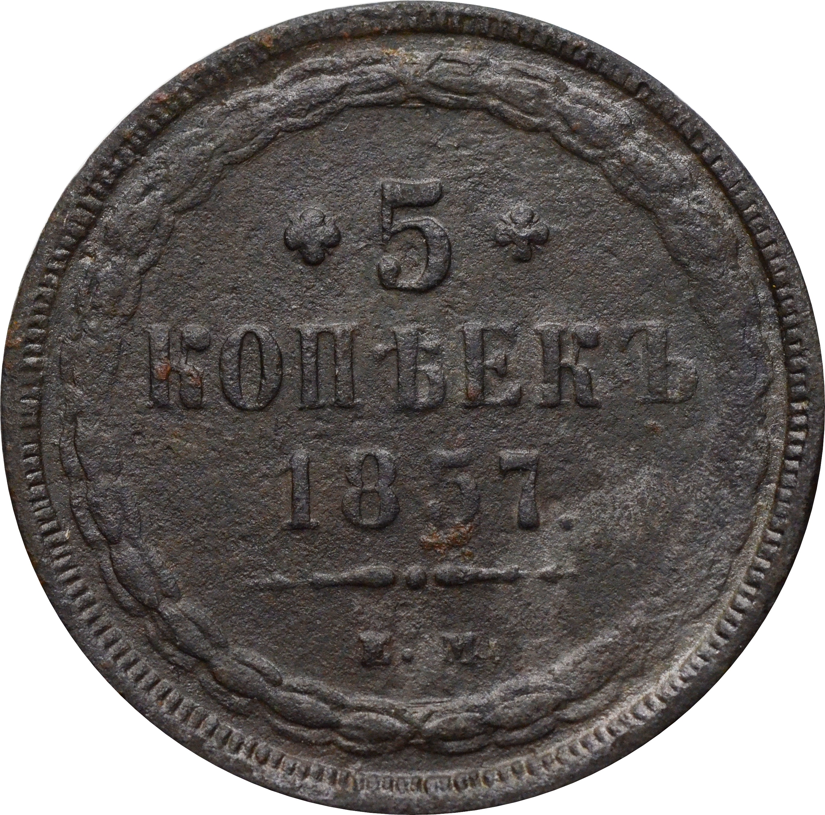 Реверс: по центру указан номинал: "5 КОПѢЕКЪ", под ним год чеканки монеты: "1857". Ниже, расположен декоративный разделитель в виде двух фигурных линий и небольшой точки между ними. Под разделителем обозначение монетного двора: "Е.М.".