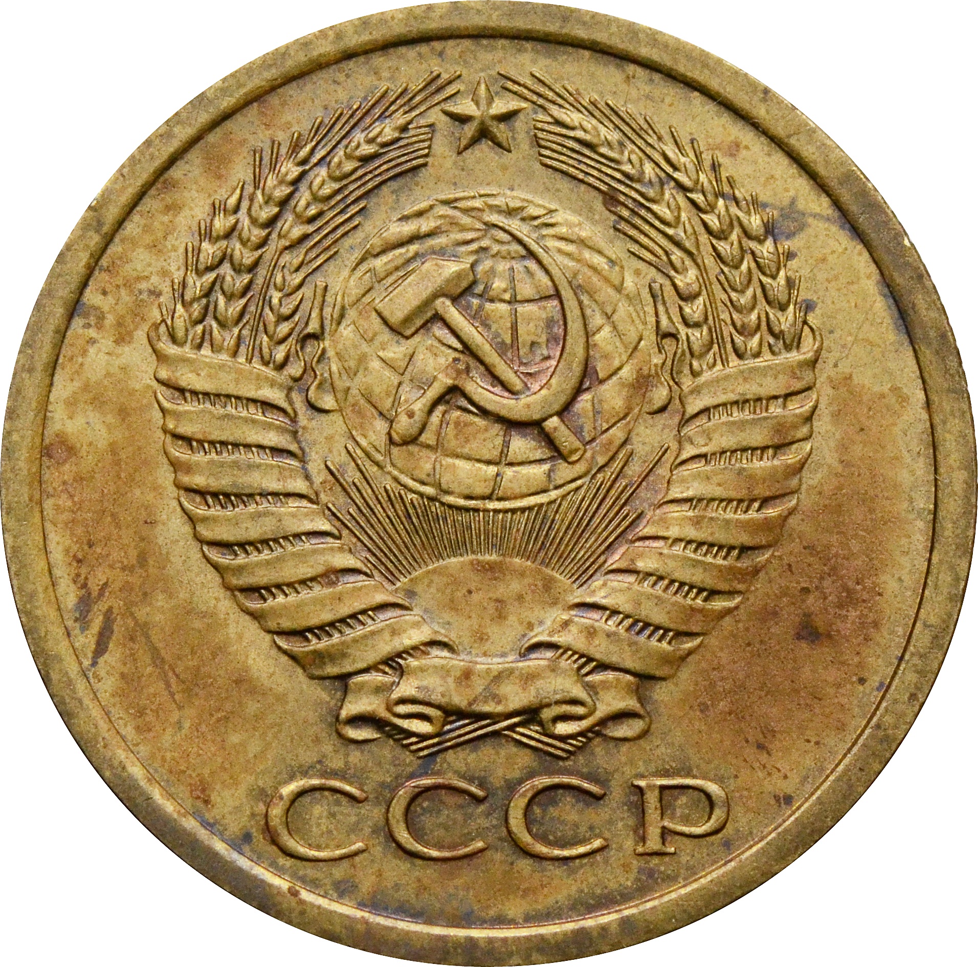 Аверс: в центре монеты изображен герб СССР с 15-ю витками ленты, под ним аббревиатура государства: "СССР".