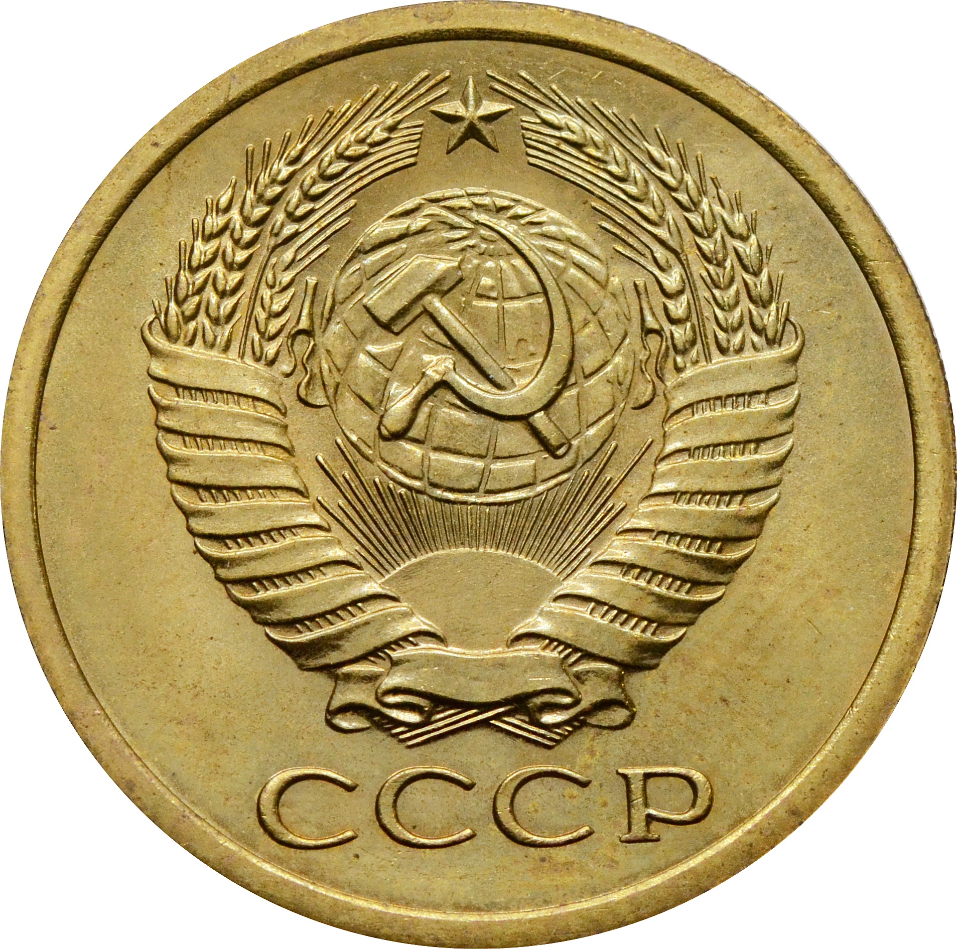 Аверс: в центре монеты изображен герб СССР с 15-ю витками ленты, под ним аббревиатура государства: "СССР".