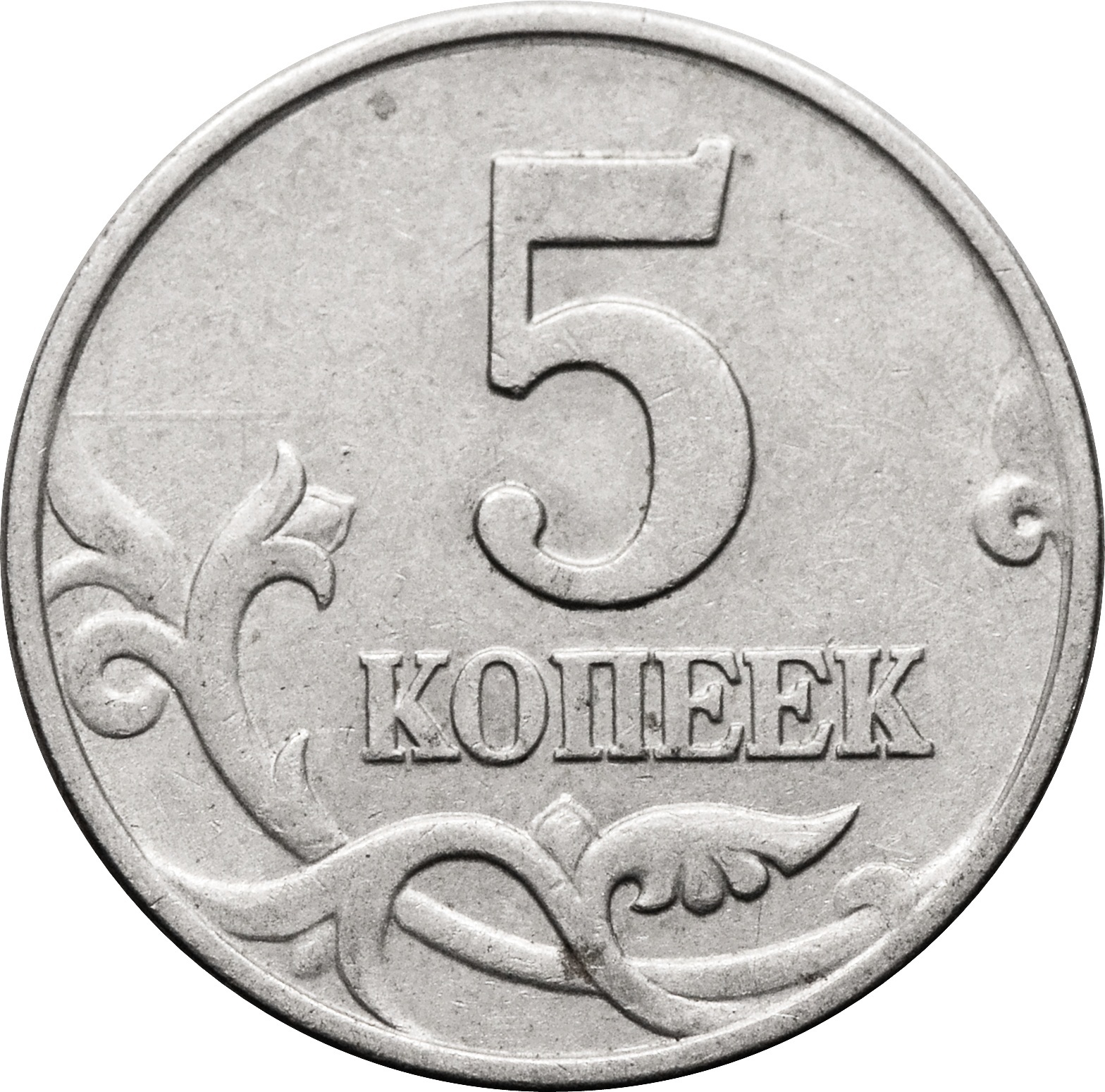 Реверс: по центру обозначение номинала монеты: "5 КОПЕЕК". В нижней части диска стилизованный растительный орнамент в виде двух ветвей