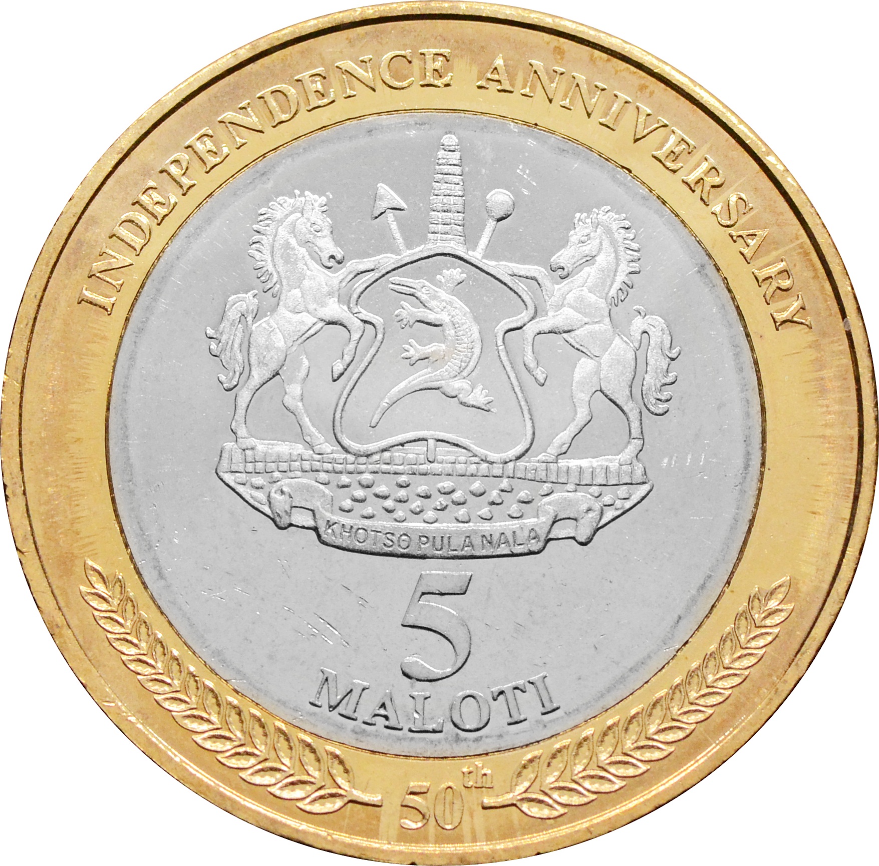 Аверс: по центру изображен герб Лесото. Под гербом расположен номинал монеты: "5 MALOTI". В верхней части полукругом написана надпись: "INDEPENDENCE ANNIVERSARY". Внизу в центре находится цифра - 50, обозначающая юбилей; вправо и влево от неё полукругом расходятся лавровые ветки.