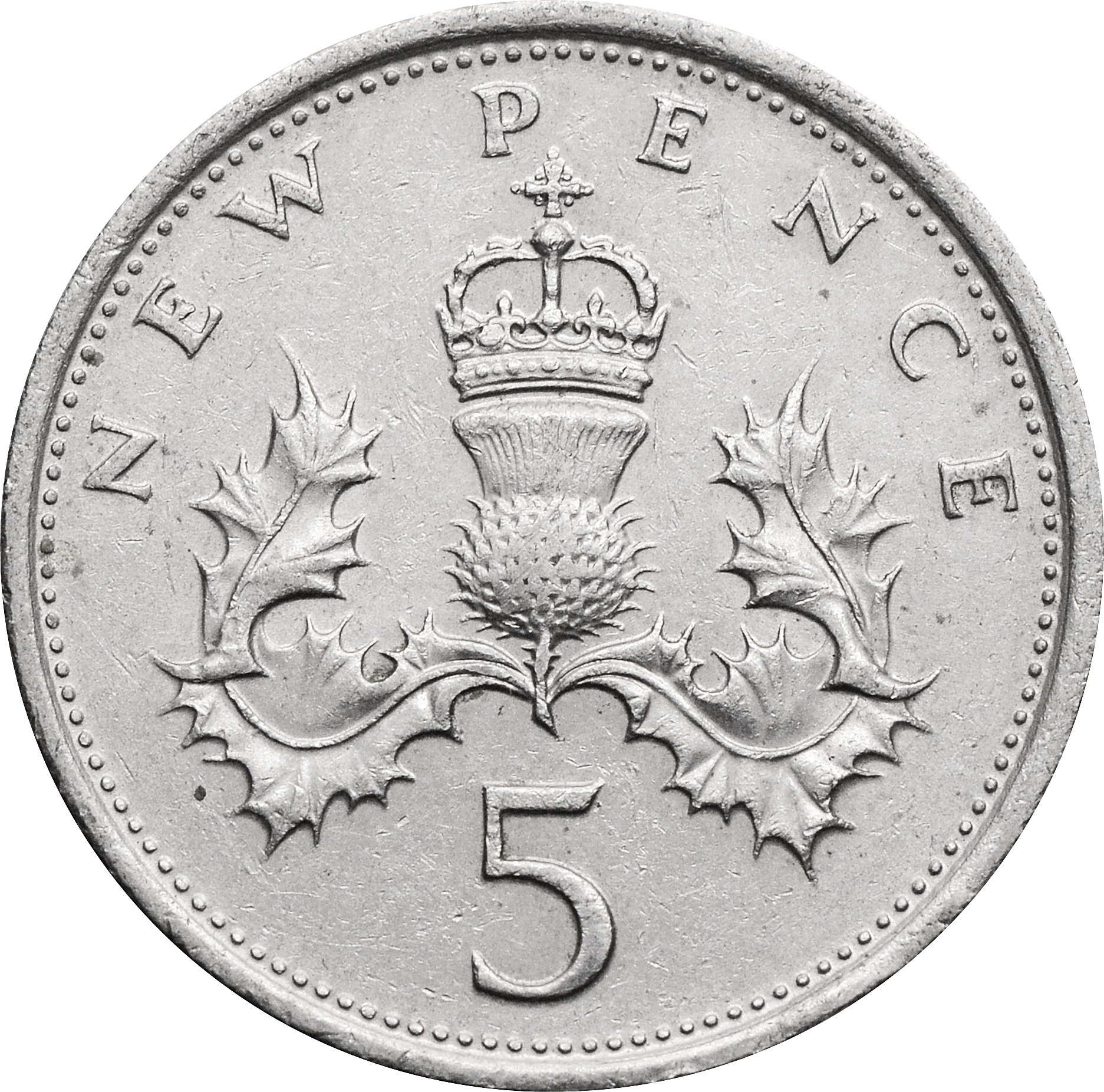 Реверс: по центру изображена корона над цветком репейника. Сверху полукругом обозначение номинала: "FIVE PENCE", а внизу – цифрой "5".