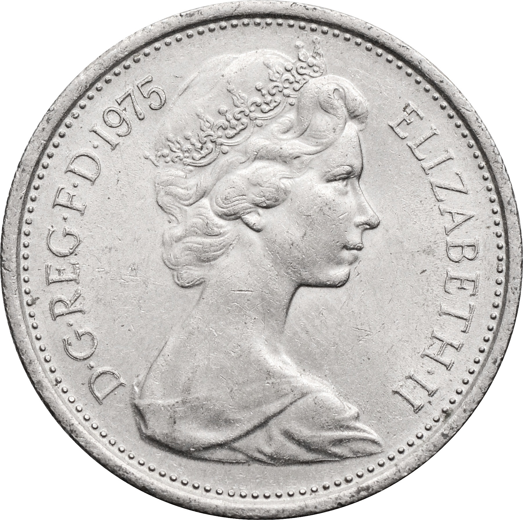 Аверс: в центре монеты размещен портрет Елизаветы II. Вокруг него надпись полукругом: "ELIZABETH II D•G•REG•F•D" и год чеканки: "1975".