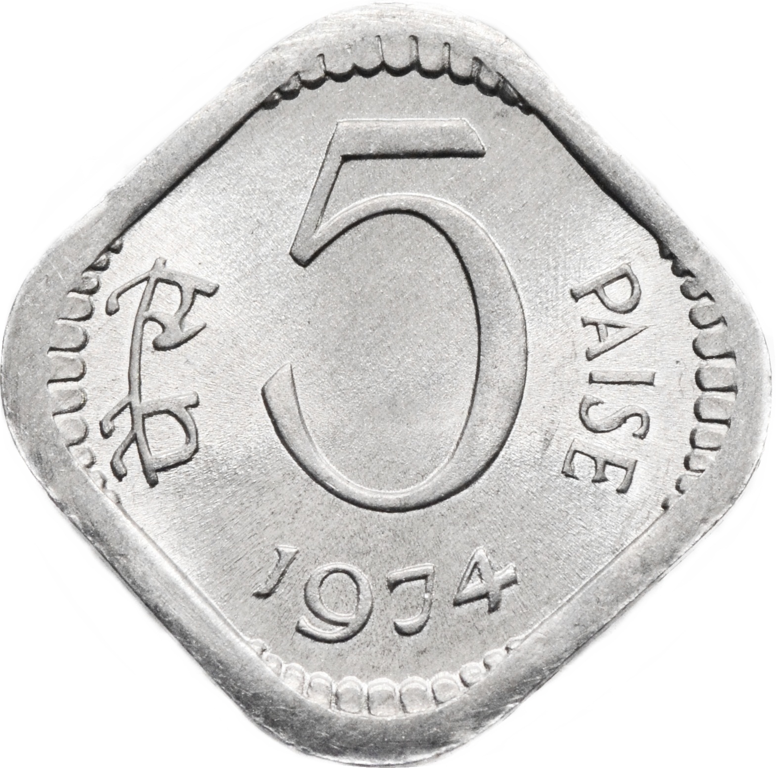 Реверс: в центре указан номинал: "5 नया पैसा". Сверху надпись: "रुपये का दसवाँ भाग", а внизу год чеканки монеты: "1974".