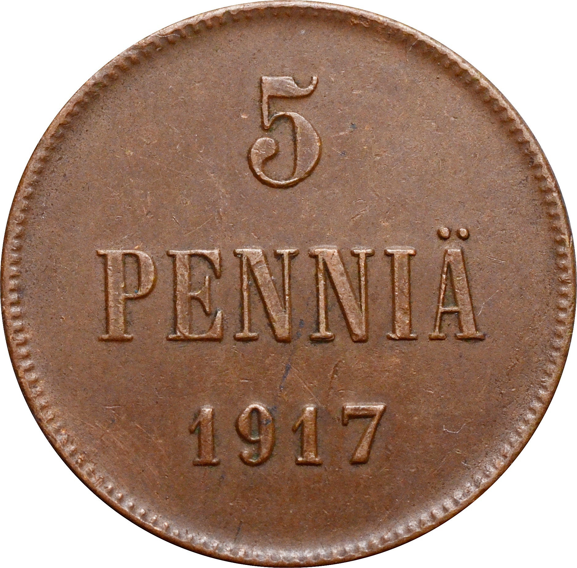 Реверс: по центру указан номинал в две строки: "5 PENNIÄ". Ниже размещен год чеканки: "1917". По окружности канта имеются рельефные элементы, выполненные в виде зубцов.