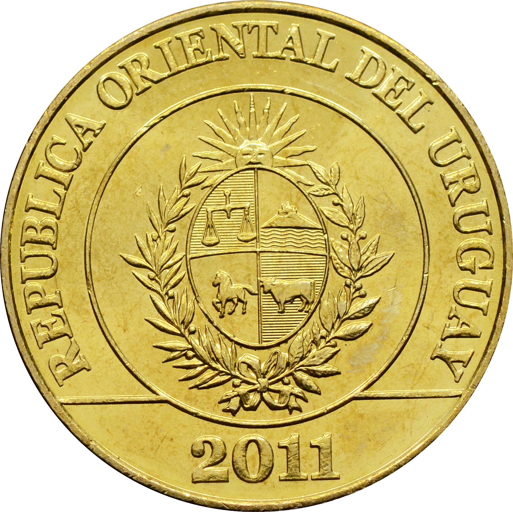 Аверс: в центре монеты размещен герб. Вдоль края монеты надпись: "REPUBLICA ORIENTAL DEL URUGUAY". Снизу указан год чеканки: "2011".
