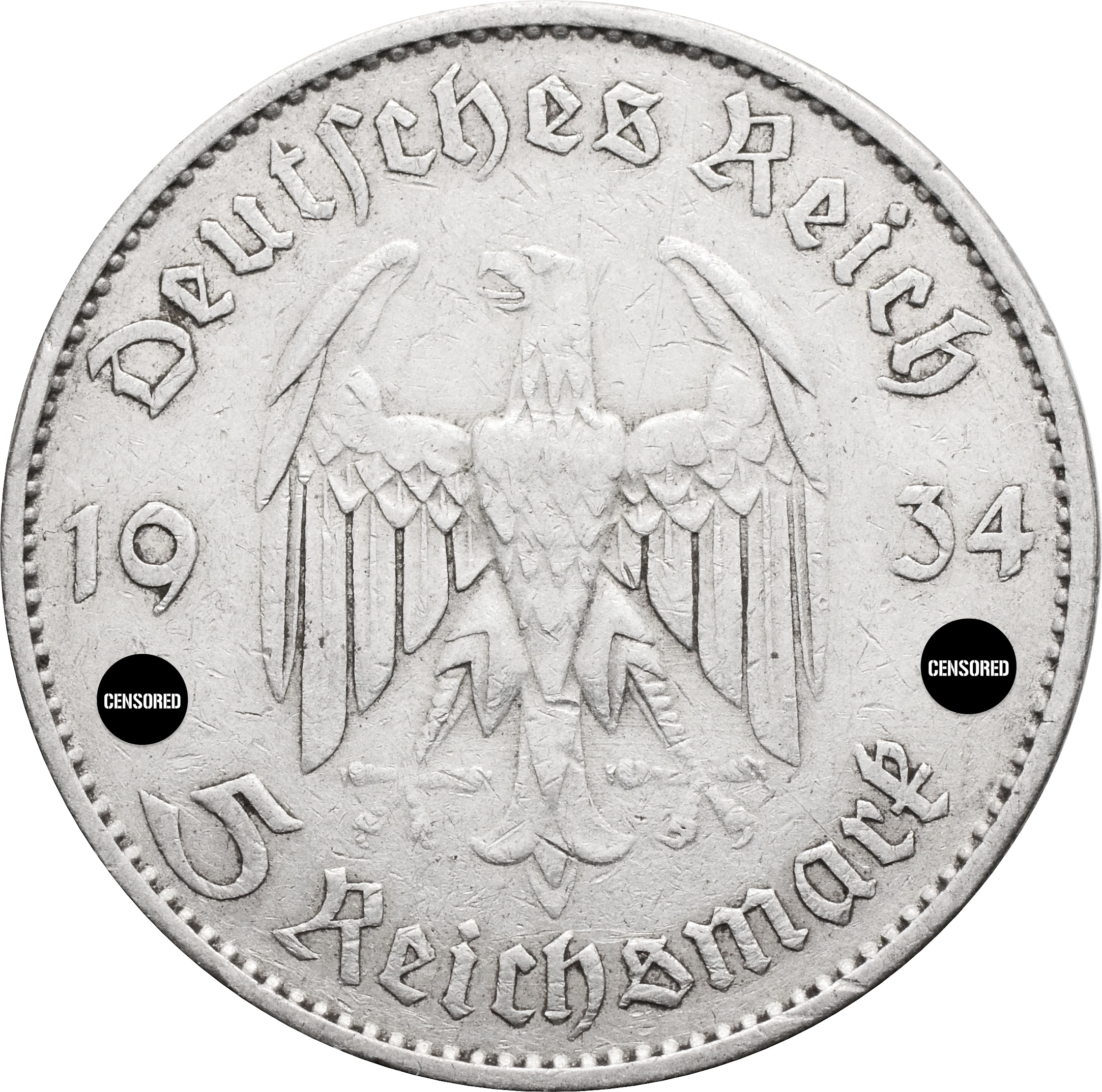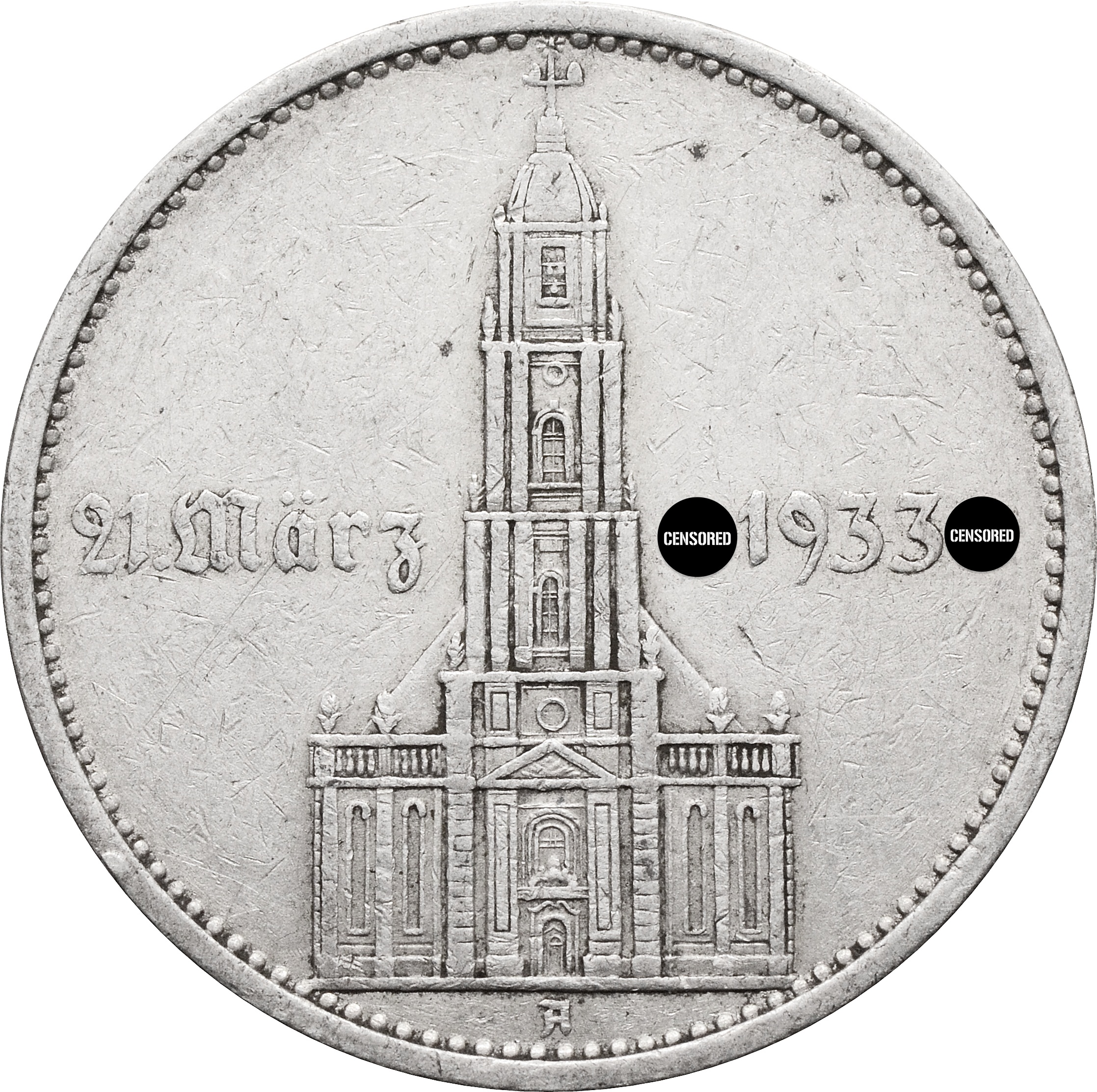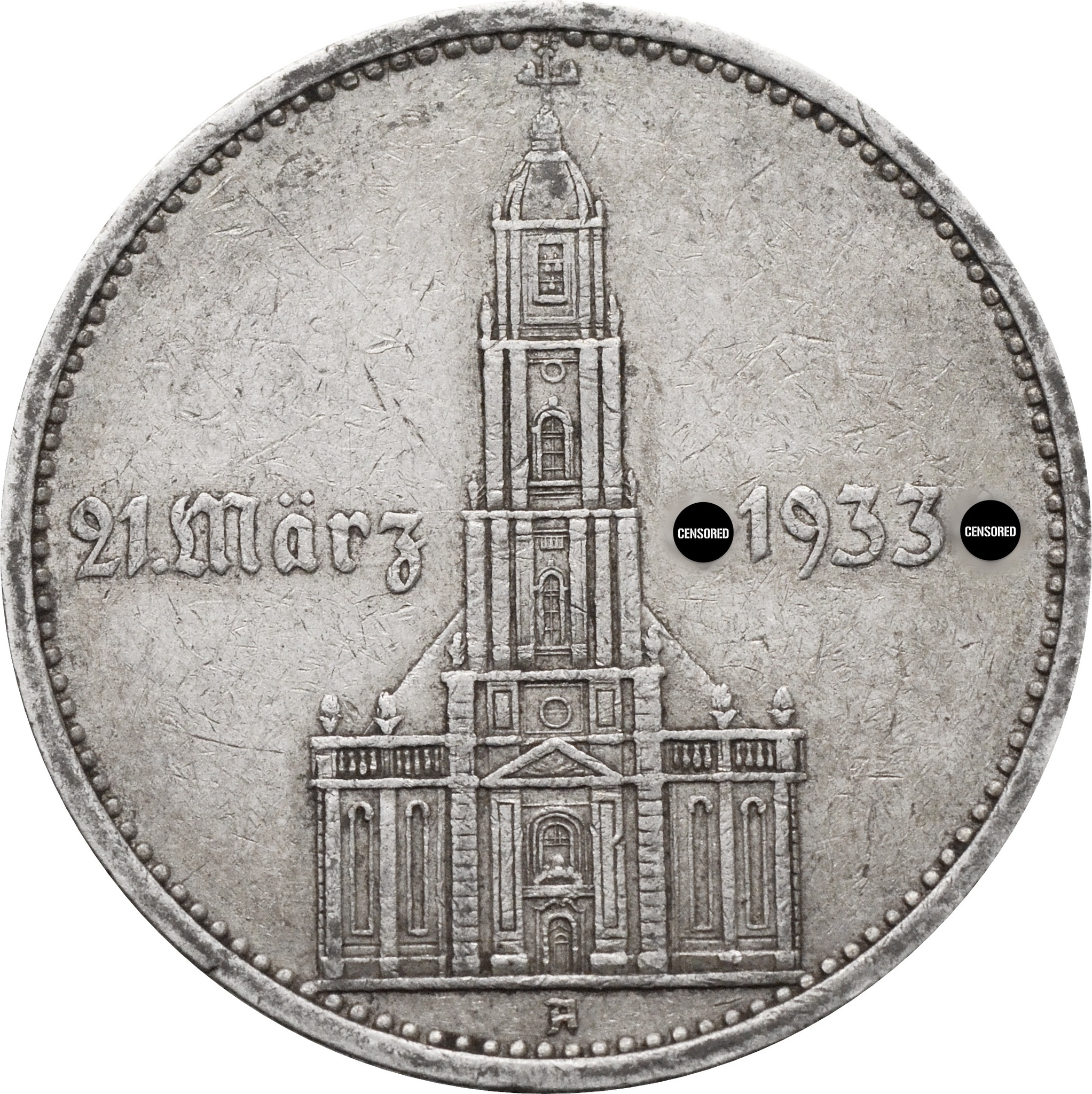 Юбилейная монета, посвященная первой годовщине нацистского режима в Германии. На монете изображена гарнизонная церковь в Потсдаме, а также указана дата - 21 марта 1933 года. Монета имеет нумизматическое "прозвище" - подписная кирха, является более редкой и ценится выше, чем монеты без указания даты.
