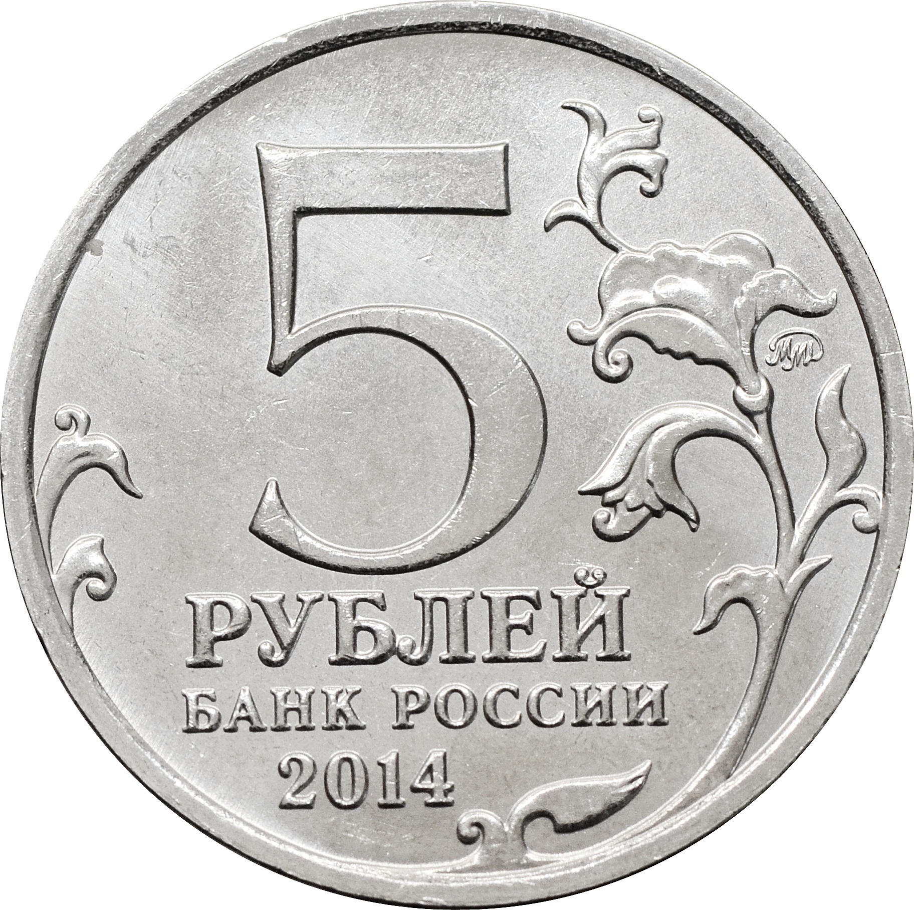 Аверс: в центре монеты указан номинал в две строки: "5 РУБЛЕЙ", ниже надпись: "БАНК РОССИИ", а под ней год чеканки: "2014". Слева и справа изображена стилизованная ветка растения. В правой части монеты указан знак монетного двора: "ММД".