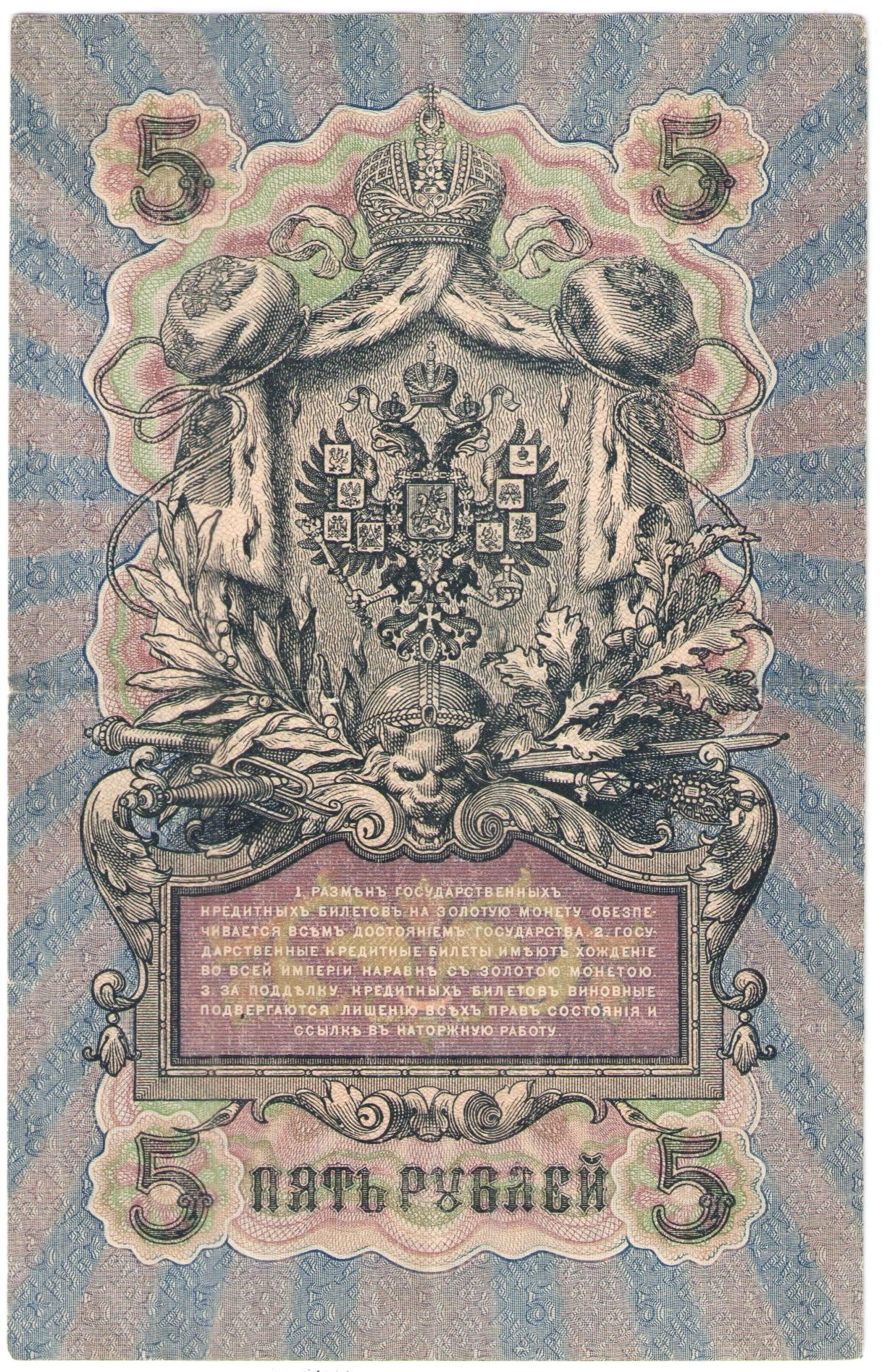Оборотная сторона: как и на лицевой, фон состоит из цифр "5", окружённых словами "РУБ". Из центра фона в стороны тянутся оранжевые лучи. Посередине крупный узор, состоящий из волнистых линий, по углам же расположились четыре розетки с цифрами "5". Внизу указан номинал прописью: "ПЯТЬ РУБЛЕЙ". В центральной части изображена императорская мантия с короной и лентой Андреевского ордена, внутри которой Малый Государственный Герб Российской империи. Под мантией держава и барельеф в виде головы льва, откуда в стороны расходятся ветви лаврового дерева и дуба, в которые вставлены скипетр и меч. Внизу фигурная рамка с барельефом и надписью мелким шрифтом извлечения из закона от 14 ноября 1897 года: