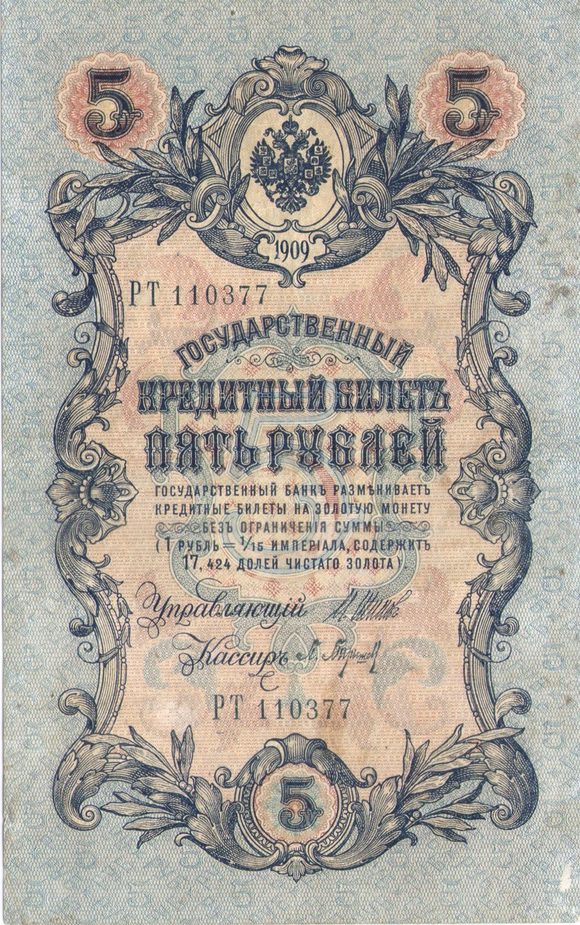 Лицевая сторона: рисунок заключён в большую фигурную рамку с растительным орнаментом. В верхней части рамки находится изображение Государственного Герба Российской империи, под которым год образца банкноты - "1909", в нижней части банкноты заключённая в круг цифра "5". Вокруг рамки всё пространство заполнено фоном из цифр "5", окружённых словами "РУБ". Внутри рамки наверху слева и внизу посередине указаны серия и номер купюры. Вверху полукругом надпись: "ГОСУДАРСТВЕННЫЙ КРЕДИТНЫЙ БИЛЕТЪ", ниже номинал: "ПЯТЬ РУБЛЕЙ", ещё ниже надпись: "Государственный банкъ размениваетъ кредитные билеты на золотую монету безъ ограниченiя суммы (1 р. = 1/15 имперiала, содержитъ 17,424 долей чистаго золота)".