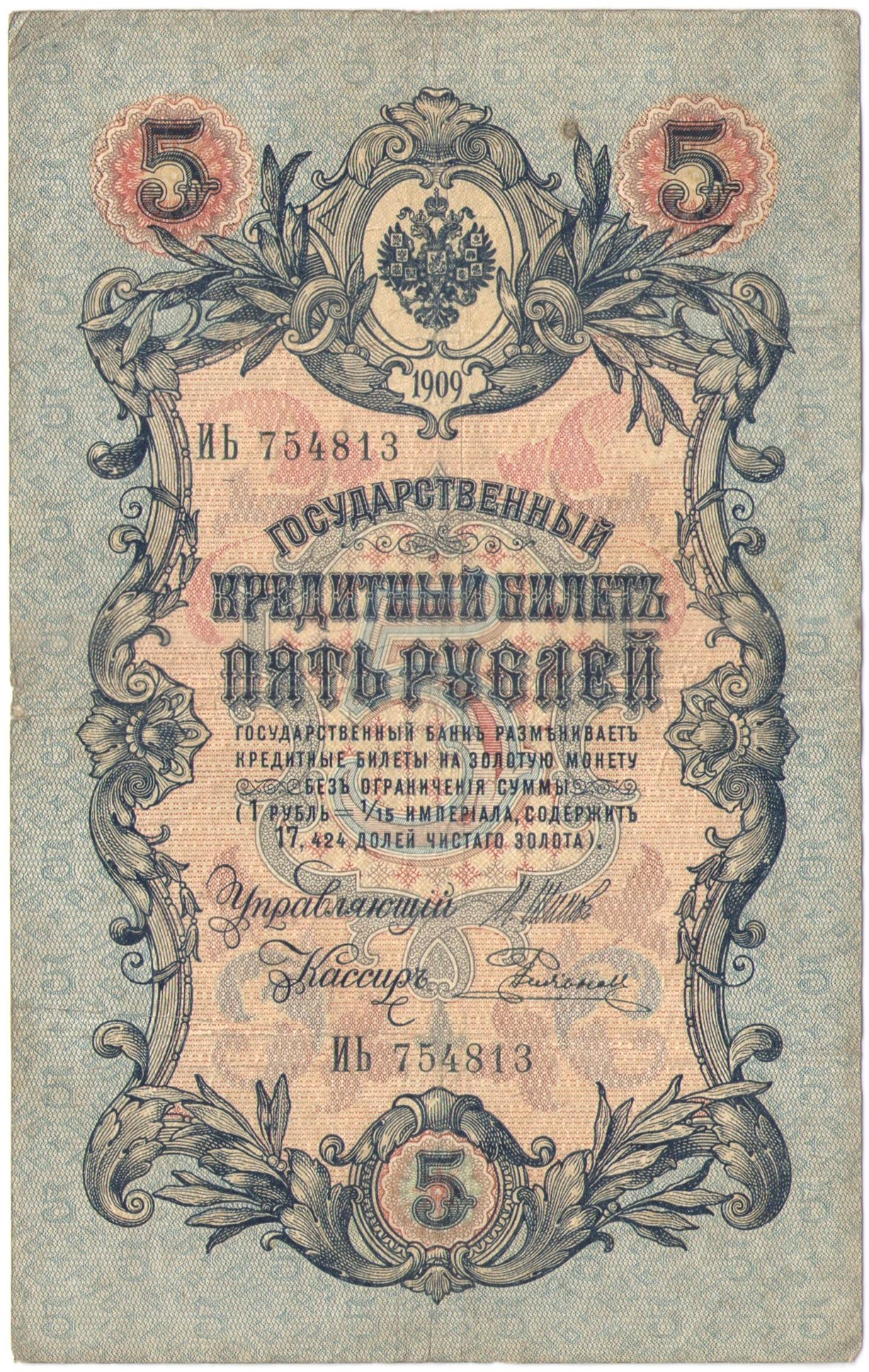 Банкнота 5 рублей 1909 Шипов, кассир Родионов (Царское правительство, номер 6 цифр) в состоянии VF.