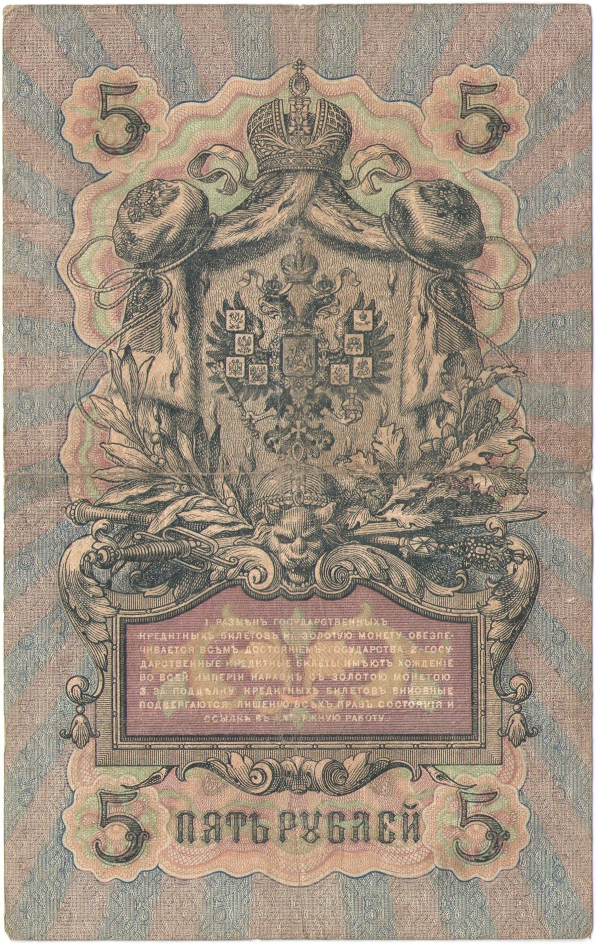 Оборотная сторона: как и на лицевой, фон состоит из цифр "5", окружённых словами "РУБ". Из центра фона в стороны тянутся оранжевые лучи. Посередине крупный узор, состоящий из волнистых линий, по углам же расположились четыре розетки с цифрами "5". Внизу указан номинал прописью: "ПЯТЬ РУБЛЕЙ". В центральной части изображена императорская мантия с короной и лентой Андреевского ордена, внутри которой Малый Государственный Герб Российской империи. Под мантией держава и барельеф в виде головы льва, откуда в стороны расходятся ветви лаврового дерева и дуба, в которые вставлены скипетр и меч. Внизу фигурная рамка с барельефом и надписью мелким шрифтом извлечения из закона от 14 ноября 1897 года:
