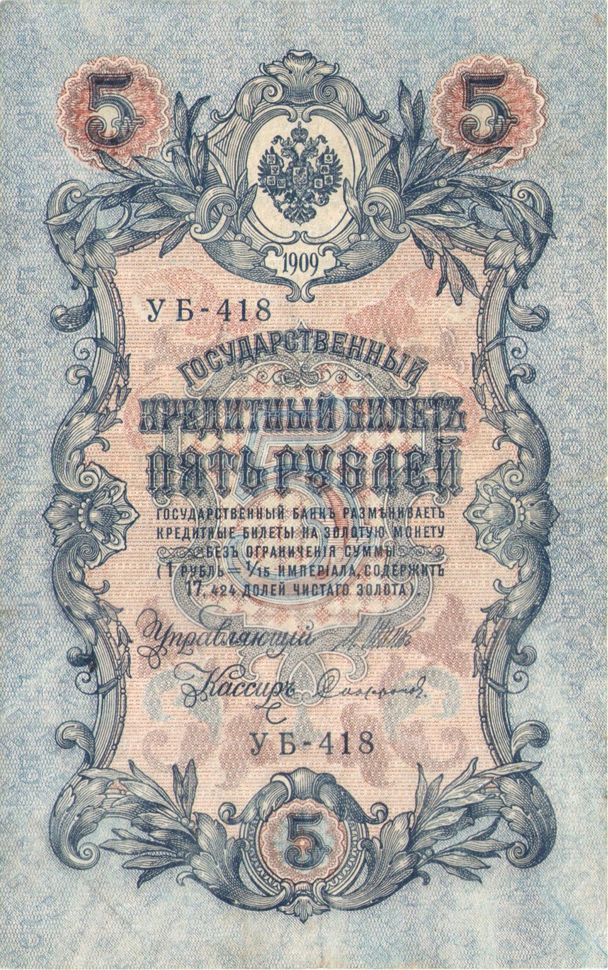 Банкнота 5 рублей 1909 управляющий Шипов, кассир Софронов (Советское правительство) серия УБ-401 - УБ-510 в состоянии XF.