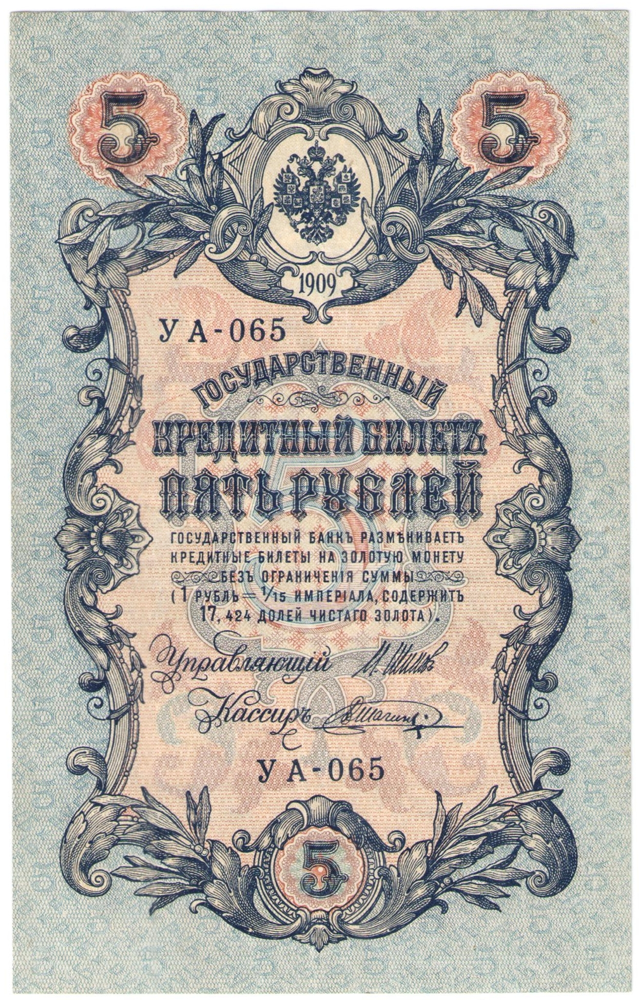Банкнота 5 рублей 1909 управляющий Шипов, кассир В. Шагин (Советское правительство) серия УА-044 - УБ-200 в состоянии XF