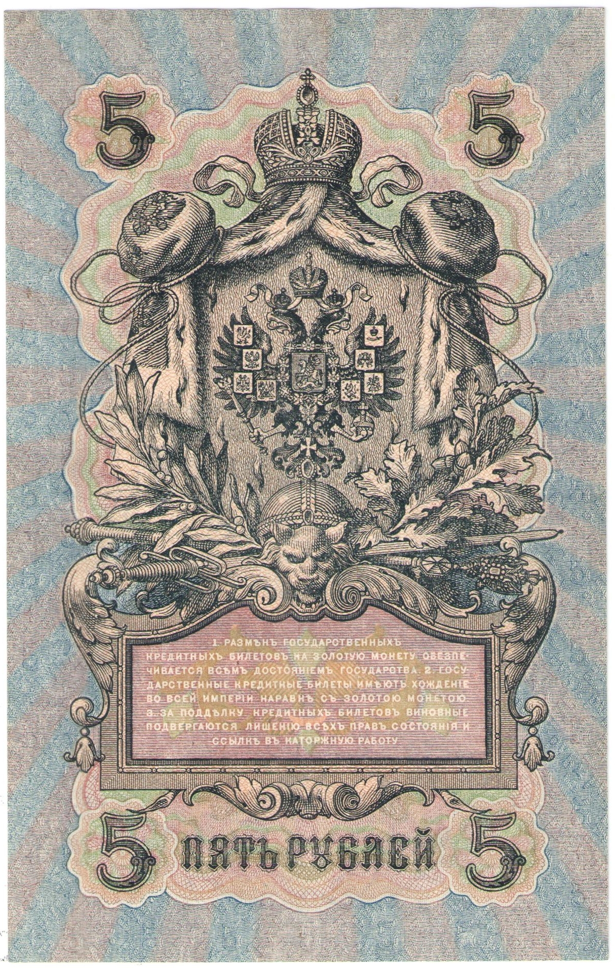 Оборотная сторона: как и на лицевой, фон состоит из цифр "5", окружённых словами "РУБ". Из центра фона в стороны тянутся оранжевые лучи. Посередине крупный узор, состоящий из волнистых линий, по углам же расположились четыре розетки с цифрами "5". Внизу указан номинал прописью: "ПЯТЬ РУБЛЕЙ". В центральной части изображена императорская мантия с короной и лентой Андреевского ордена, внутри которой Малый Государственный Герб Российской империи. Под мантией держава и барельеф в виде головы льва, откуда в стороны расходятся ветви лаврового дерева и дуба, в которые вставлены скипетр и меч. Внизу фигурная рамка с барельефом и надписью мелким шрифтом извлечения из закона от 14 ноября 1897 года: