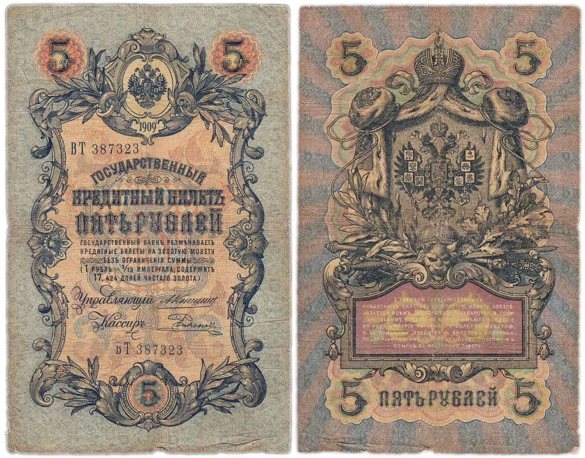 Банкнота 5 рублей 1909 (случайный номер и кассир)