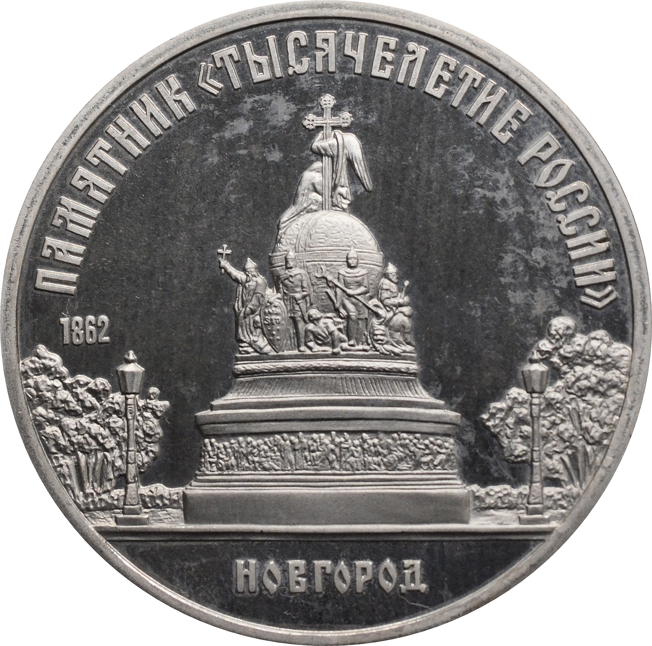 Реверс: по центру монеты изображен памятник «Тысячелетие России» в Новгороде. Под ним надпись: "НОВГОРОД". Сверху, вдоль канта, подпись: "памятник «Тысячелетие России»".