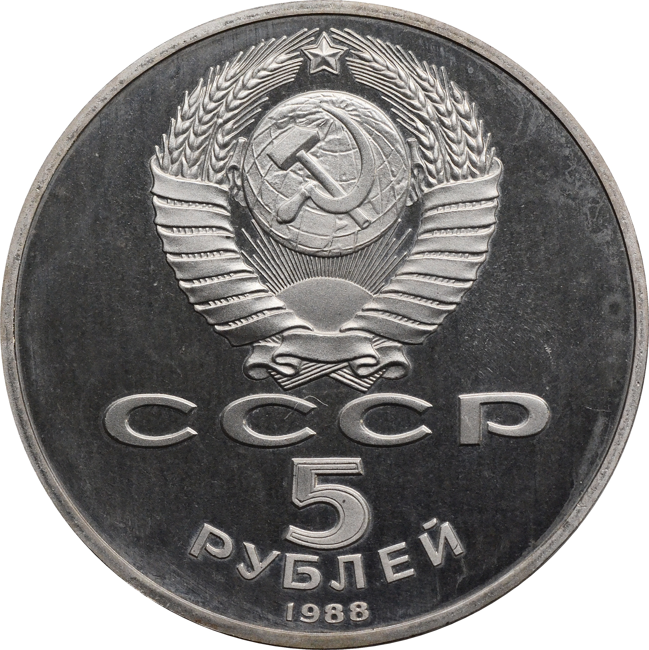 Аверс: в верхней части монеты изображен герб Советского союза с 15-ю витками ленты. Под ним содержится надпись: "СССР", разделенная пополам гербом. Снизу обозначение номинала в две строки: "5 РУБЛЕЙ", а ниже размещен год чеканки: "1988".