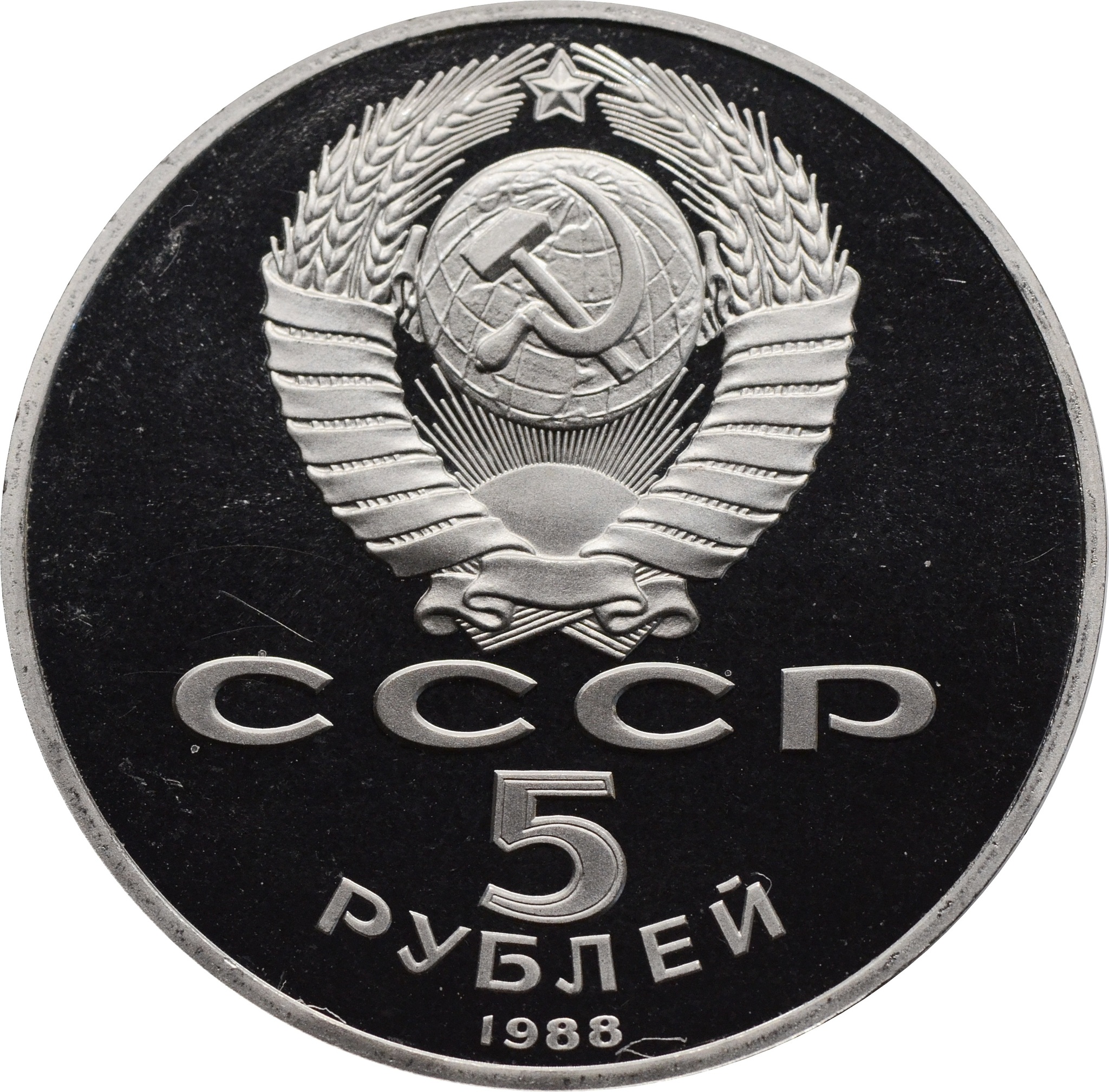 Аверс: в верхней части монеты изображен герб Советского союза с 15-ю витками ленты. Под ним содержится надпись: "СССР", разделенная пополам гербом. Снизу обозначение номинала в две строки: "5 РУБЛЕЙ". В самом низу указан год чеканки: "1988".