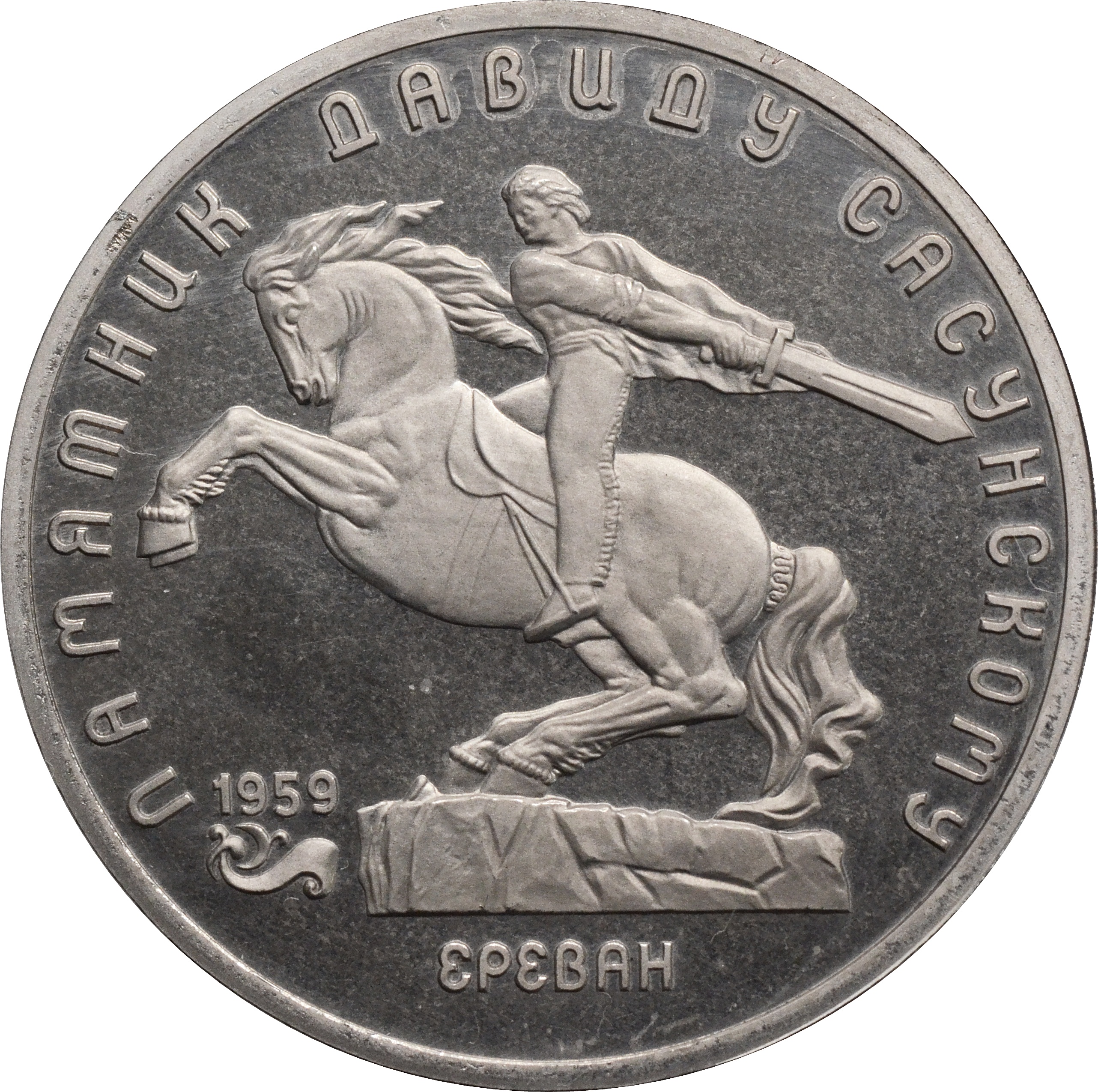 Монета 5 рублей 1991 «Памятник Давиду Сасунскому в Ереване» в исполнении PROOF капсула.