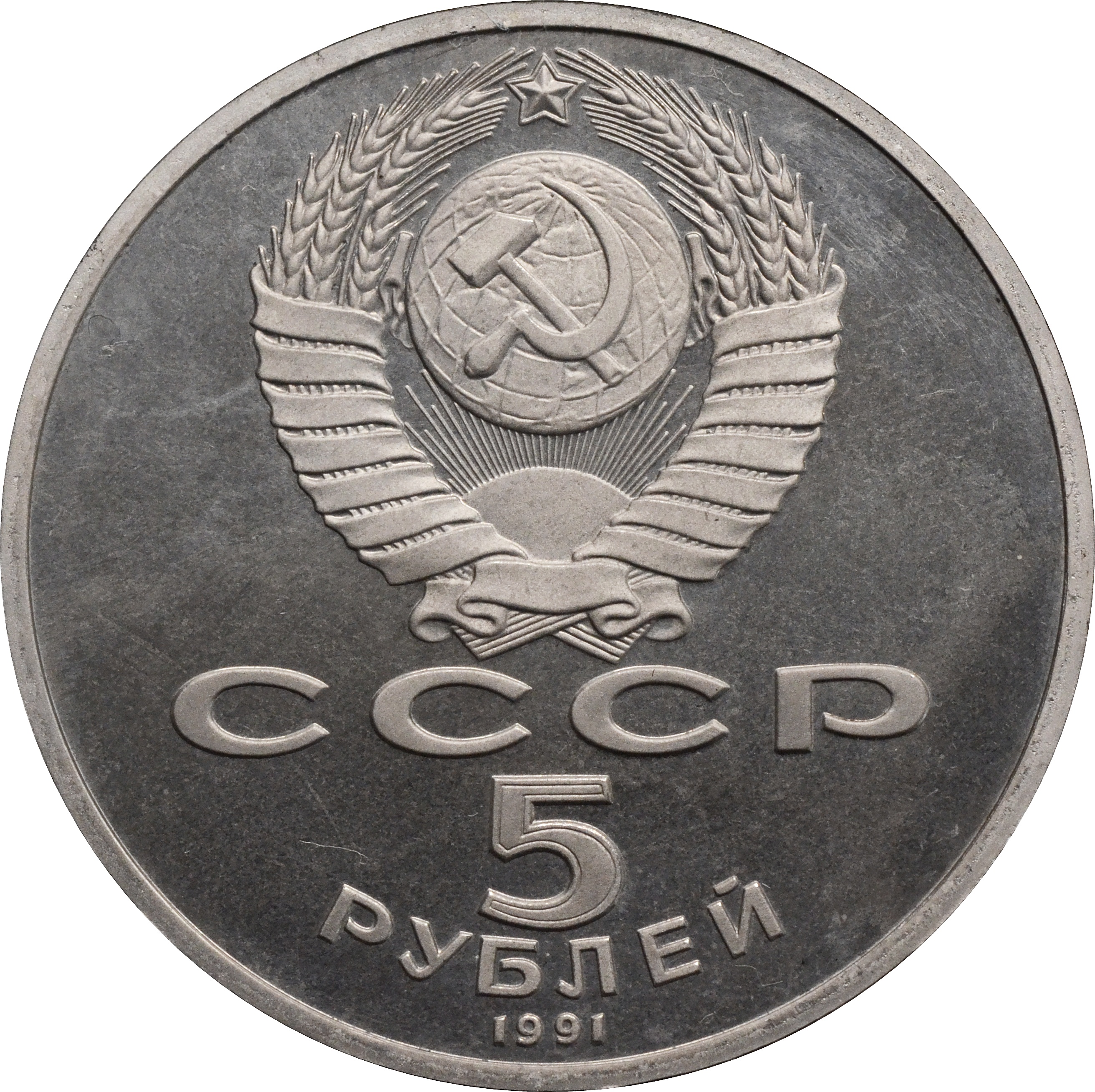Аверс: в верхней части монеты изображен герб Советского союза с 15-ю витками ленты. Под ним содержится надпись: "СССР", разделенная пополам гербом. Снизу обозначение номинала в две строки: "5 РУБЛЕЙ". В самом низу указан год чеканки: "1991".