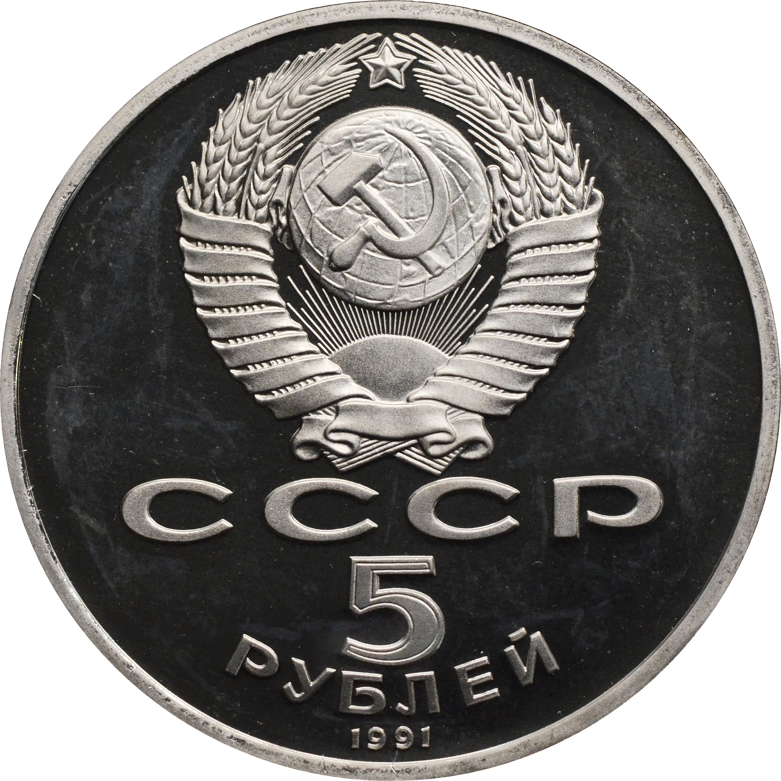 Аверс: в верхней части монеты изображен герб Советского союза с 15-ю витками ленты. Под ним содержится надпись: "СССР", разделенная пополам гербом. Снизу обозначение номинала в две строки: "5 РУБЛЕЙ". В самом низу указан год чеканки: "1991".