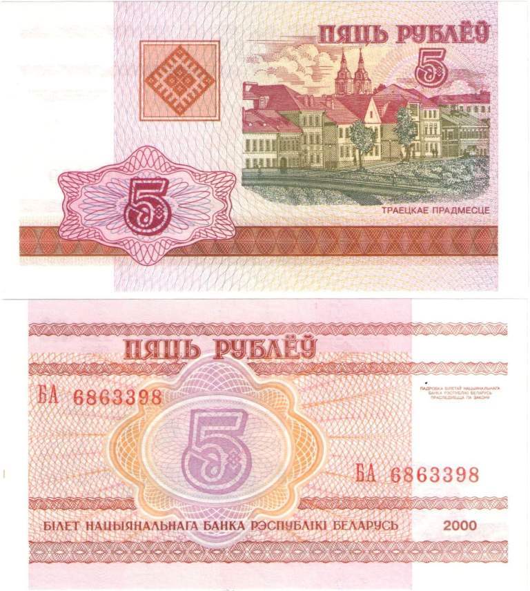 Оборотная сторона: по центру изображена декоративная виньетка, а внутри ее размещена большая цифра - "5". Сверху между двумя орнаментальными лентами размещена надпись: "ПЯЦЬ РУБЕЛЬ". Серия и номер банкноты указаны красным цветом слева сверху и справа снизу относительно центральной виньетки. В нижней части купюры содержится надпись: "БІЛЕТ НАЦЫЯНАЛЬНАГА БАНКА РЭСПУБЛІКІ БЕЛАРУСЬ". В правой нижней части обозначен год: "2000". В верхней правой части содержится надпись мелкими буквами: "ПАДРОБКА БІЛЕТАЎ НАЦЫЯНАЛЬНАГА БАНКА РЭСПУБЛІКІ БЕЛАРУСЬ ПРАСЛЕДУЕЦЦА ПА ЗАКОНУ".