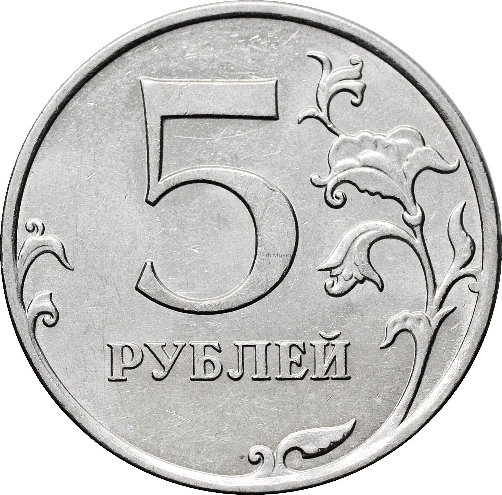 Реверс: по центру указан номинал монеты: "5 РУБЛЕЙ". Внизу вдоль канта и в правой части диска стилизованный растительный орнамент в виде изогнутой ветви с переплетающимися стеблями.