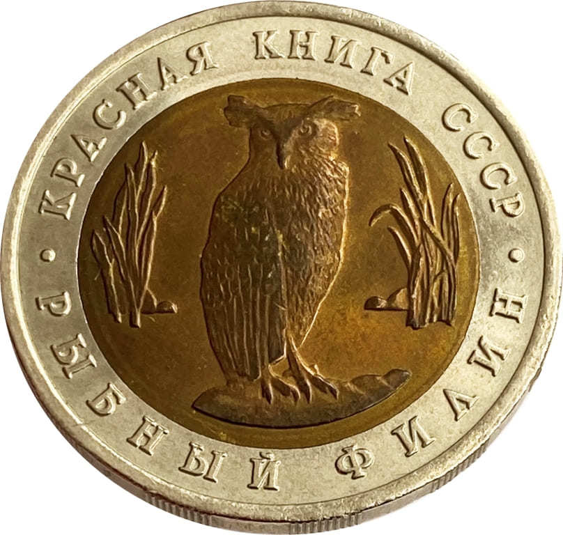 Реверс: в центре монеты изображен рыбный филин на фоне водяных зарослей. По окружности находятся надписи: сверху - "КРАСНАЯ КНИГА СССР", а внизу - "РЫБНЫЙ ФИЛИН".
