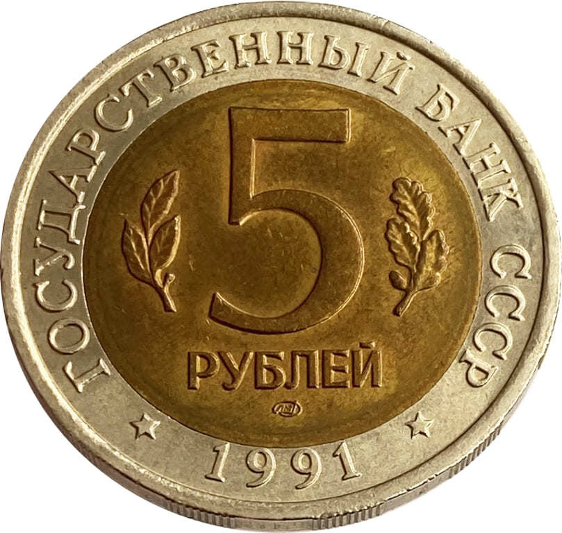 Аверс: сверху, вдоль края монеты, расположена надпись: "ГОСУДАРСТВЕННЫЙ БАНК СССР", внизу указан год чеканки: "1991". По центру номинал в две строки: "5 РУБЛЕЙ". Слева находится лавровая, а справа дубовая ветви. Под номиналом изображен символ монетного двора: "ЛМД".