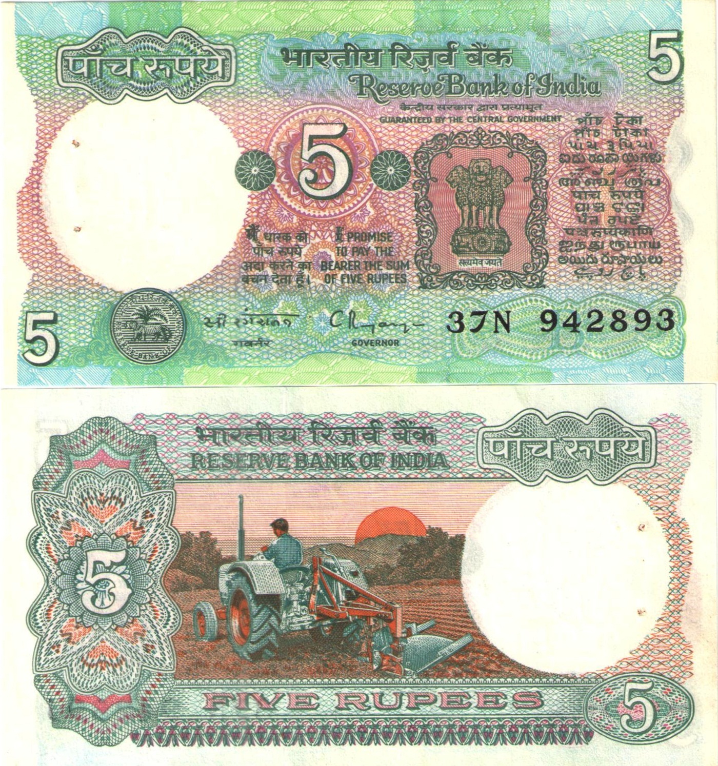 Обратная сторона: правее центра банкноты расположено изображение фермера на тракторе, который пашет землю. Сверху надпись: "RESERVE BANK OF INDIA" Снизу указан номинал: "FIVE RUPEES".