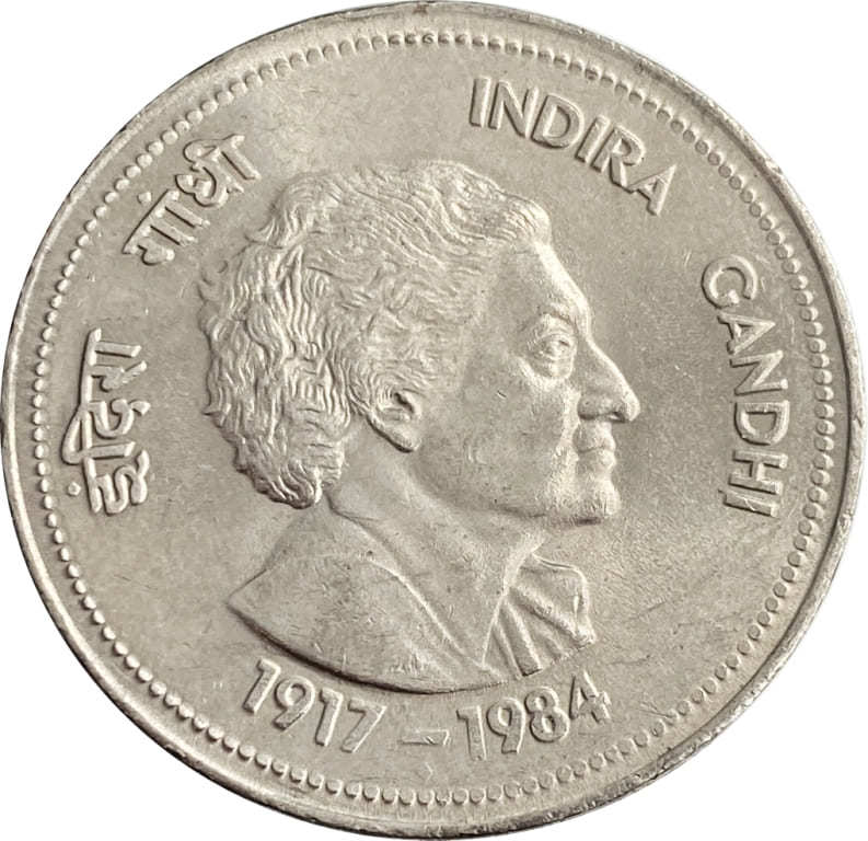 Аверс: в центре расположен портрет Индиры Ганди. По бокам расположены надписи: слева - "इंदिरा गांधी", а справа - "INDIRA GANDHI". Снизу годы жизни" 1917-1984".
